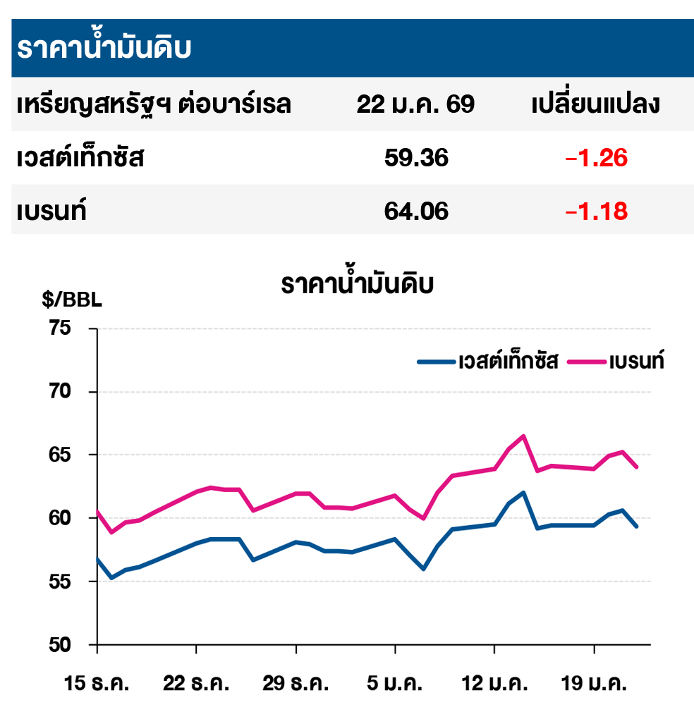 (-) ราคาน้ำมันดิบปรับลดลง หลังนายโวโลดิเมียร์ เซเลนสกี ประธานาธิบดียูเครน เผยหลังการพูดคุยกับนายโดนัลด์ ทรัมป์ ประธานาธิบดีสหรัฐฯ นอกรอบการประชุม World Economic Forum ว่าการหารือแผนสันติภาพมีทิศทางเชิงบวกเพิ่มขึ้น โดยจะมีการจัดการประชุมไตรภาคี (Trilateral meeting) ประกอบด้วย สหรัฐฯ รัสเซียและยูเครน ที่สหรัฐอาหรับเอมิเรตส์ โดยล่าสุดนายสตีฟ วิทคอฟฟ์ ทูตพิเศษของสหรัฐฯ เดินทางไปยังรัสเซียเพื่อหารือกับนายวลาดิเมียร์ ปูติน ประธานาธิบดีรัสเซีย ในประเด็นที่เกี่ยวข้องกับแผนสันติภาพอีกครั้ง อย่างไรก็ดี ผู้นำยูเครนออกมายอมรับว่า ประเด็นในเรื่องดินแดนของยูเครนยังคงเป็นประเด็นที่ไม่สามารถหาข้อสรุปได้