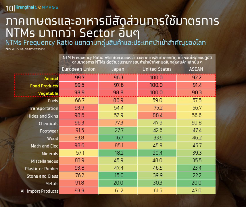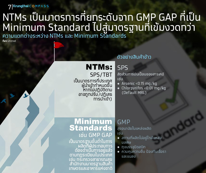 “สินค้าเกษตรและอาหารที่อยู่ในกลุ่มที่มีความเสี่ยงสูงและจำเป็นต้องยกระดับมาตรฐานเพื่อให้สอดคล้องกับ NTMs ของประเทศคู่ค้า ได้แก่ สินค้าในกลุ่มเนื้อสัตว์แปรรูป อาหารทะเลแปรรูป และผักและผลไม้ เนื่องจากเป็นกลุ่มที่มีความเสี่ยงจากการแจ้งเตือนมาตรการ NTMs ทั่วโลกในสัดส่วนสูง และมีผู้ประกอบการ SMEs อยู่เป็นจำนวนมาก โดยสินค้าในกลุ่มที่กล่าวมาข้างต้น มีมูลค่าการส่งออกไปตลาดโลกรวมกันถึง 6 แสนล้านบาทต่อปี หรือคิดเป็นราว 33% ของมูลค่าส่งออกสินค้าเกษตรและอาหารรวมของไทย ซึ่งอยู่ที่กว่า 1.8 ล้านล้านบาทต่อปี”
