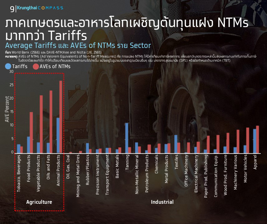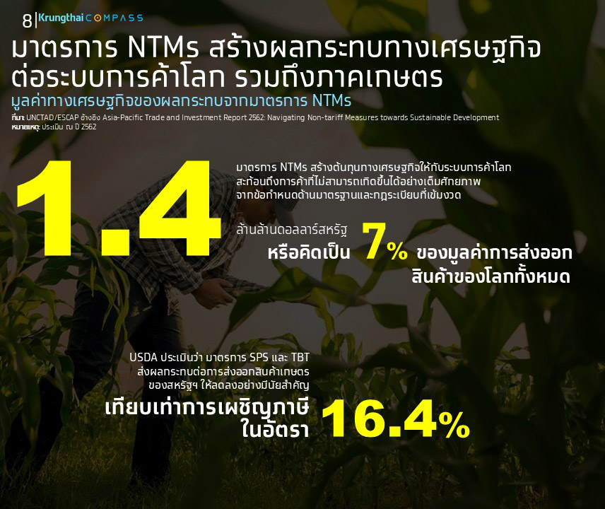 ดร.สุปรีย์ ศรีสำราญ ผู้อำนวยการฝ่าย ศูนย์วิจัย Krungthai COMPASS ธนาคารกรุงไทย กล่าวว่า มาตรการ NTMs ที่เข้มข้นขึ้น ทำให้ภาคเกษตรและอาหารต้องแบกรับต้นทุนแฝงในระดับเทียบเท่าภาษีนำเข้าเฉลี่ยอยู่ที่ 17.6% ซึ่งสูงกว่าภาคอุตสาหกรรมอยู่ที่ราว 6% อย่างไรก็ดี กลุ่มสินค้าเกษตรและอาหาร เป็นหนึ่งในอุตสาหกรรมเป้าหมายของโครงการ Reinvent Thailand ที่มีศักยภาพสามารถต่อยอดเป็น S-Curve และสร้างมูลค่าเพิ่มให้กับ Supply Chain ในประเทศ ซึ่งหากสามารถยกระดับการผลิตให้ได้มาตรฐานในระดับสากลจะช่วยเพิ่มขีดความสามารถในการแข่งขันในตลาดโลก