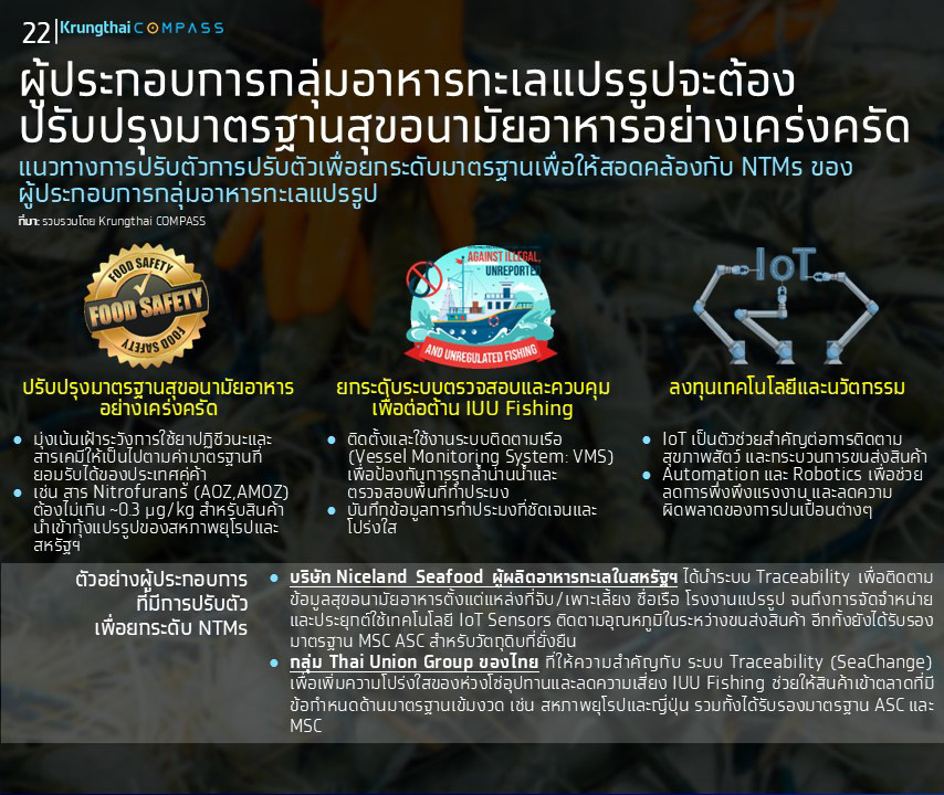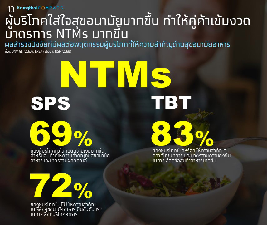 นายปราโมทย์ วัฒนานุสาร นักวิเคราะห์ ศูนย์วิจัย Krungthai COMPASS กล่าวเสริมว่า ธุรกิจเกษตรและอาหารไทยจำเป็นต้องเร่งปรับตัว เนื่องจากความตระหนักด้านสุขอนามัยของผู้บริโภคที่เพิ่มขึ้น เป็นแรงกดดันให้คู่ค้าเข้มงวดมาตรการ NTMs มากขึ้น ประกอบกับภาครัฐให้การสนับสนุนภาคเกษตรและอาหารแปรรูปที่มุ่งยกระดับมาตรฐานการผลิตและพัฒนาระบบตรวจสอบย้อนกลับอย่างจริงจัง นอกจากนี้ การยกระดับ NTMs ทำให้ทิศทางธุรกิจสอดคล้องกับความยั่งยืนโลก โดยมาตรการ NTMs เชื่อมโยงกับการบรรลุเป้าหมาย SDGs โดยเฉพาะในด้านการมีสุขภาพและความเป็นอยู่ที่ดี (SDG 3) และการผลิตและบริโภคที่ยั่งยื่น (SDG 12) ซึ่งจะกลายเป็นกรอบสำคัญที่ผู้ประกอบการเกษตรและอาหารไทยหลีกเลี่ยงไม่ได้ในระยะต่อไป