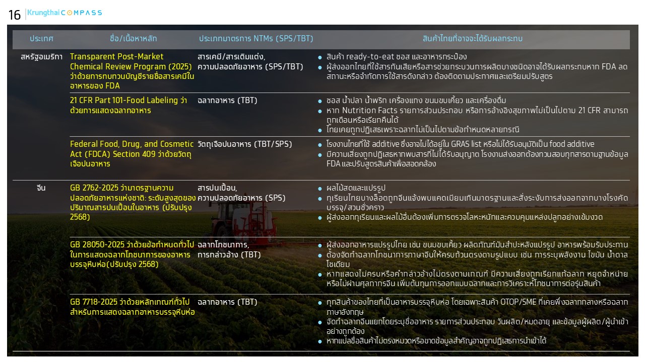 ศูนย์วิจัย Krungthai COMPASS ชี้ มาตรการทางการค้าที่มิใช่ภาษี (Non-Tariff Measures: NTMs) กำลังเป็นอุปสรรคสำคัญในการค้าโลก โดยเฉพาะในกลุ่มสินค้าเกษตรและอาหาร ซึ่งคาดว่าจะกระทบตลาดส่งออกไทยกว่า 6 แสนล้านบาท หรือคิดเป็นราว 33% ของมูลค่าส่งออกสินค้าเกษตรและอาหารทั้งหมดของไทย แนะผู้ประกอบการ 3 กลุ่มหลัก ได้แก่ เนื้อสัตว์แปรรูป อาหารทะเลแปรรูป และผักและผลไม้ เร่งยกระดับมาตรฐานด้านสุขอนามัย เช่น การปนเปื้อนสารเคมีและสารตกค้าง อย่างจริงจัง และนำเทคโนโลยีดิจิทัลมาใช้ตรวจสอบย้อนกลับ เพื่อเพิ่มขีดความสามารถในการแข่งขันในตลาดโลก
