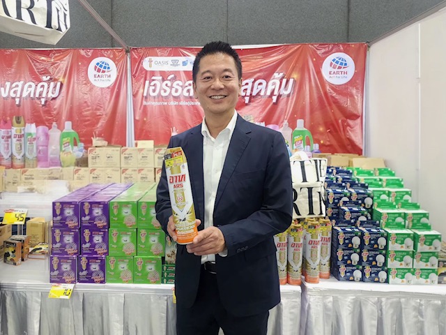 การเข้าร่วมงานครั้งนี้ สะท้อนความมุ่งมั่นของ เอิร์ธ ในการขับเคลื่อนองค์กรตามแผน “Must be No.1” ซึ่งมุ่งเน้นการเติบโตอย่างยั่งยืน พร้อมนำเสนอนวัตกรรมผลิตภัณฑ์เพื่อสุขอนามัยในงาน อาทิ สเปรย์กำจัดยุงและแมลง อาท เจ็ท โกลด์ (ARS JET GOLD), เครื่องไฟฟ้าไล่ยุง อาท โนแมท พลัส (ARS NOMAT PLUS) และยาจุดกันยุง อาท พลัส (ARS PLUS MOSQUITO COIL) ภายใต้แบรนด์อาท และจัดโปรโมชันลดสุดคุ้มทุกรายการ ซึ่งได้รับความสนใจจากผู้ร่วมงานอย่างล้นลาม นายคุนิฮารุ ซาซากิ กล่าว