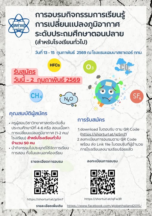 สถาบันส่งเสริมการสอนวิทยาศาสตร์และเทคโนโลยี (สสวท.) เปิดรับสมัครครูระดับประถมศึกษาตอนปลาย เข้ารับการอบรม "กิจกรรมการเรียนรู้การเปลี่ยนแปลงภูมิอากาศ ระดับประถมศึกษาตอนปลาย (สำหรับโรงเรียนทั่วไป)" ระหว่างวันที่ 13 -15 กุมภาพันธ์ 2569 ณ โรงแรมแอมบาสซาเดอร์ สุขุมวิท กรุงเทพฯ เพื่อเสริมสร้างความรู้ ความเข้าใจ และแนวทางการจัดการเรียนรู้ด้านการเปลี่ยนแปลงภูมิอากาศที่สามารถนำไปประยุกต์ใช้ได้จริงทั้งในและนอกห้องเรียน เตรียมพร้อมรับมือวิกฤตโลกร้อน โดย สสวท. สนับสนุนค่าอาหารกลางวัน อาหารว่าง เอกสารประกอบการอบรม และค่าที่พัก คุณสมบัติผู้สมัครเป็นครูผู้สอนวิชาวิทยาศาสตร์ ป.4–6 หรือสอนเนื้อหาการเปลี่ยนแปลงภูมิอากาศ โรงเรียนละ 1–2 คน สมัครได้ตั้งแต่วันนี้ถึง 2 กุมภาพันธ์ 2569 รับจำนวนจำกัด ผู้สนใจสามารถดาวน์โหลดเอกสารและดูรายละเอียดการสมัครได้ที่ https://globethailand.ipst.ac.th/news.php