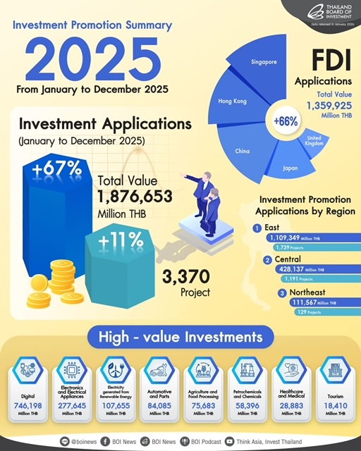 นายนฤตม์ เทอดสถีรศักดิ์ เลขาธิการคณะกรรมการส่งเสริมการลงทุน (บีโอไอ) เปิดเผยว่า คำขอรับการส่งเสริมการลงทุนในปี 2568 เพิ่มขึ้นอย่างมีนัยสำคัญ ทั้งจำนวนโครงการและเงินลงทุน โดยมีจำนวน 3,370 โครงการ เพิ่มขึ้นร้อยละ 11 และมีเงินลงทุน 1,876,653 ล้านบาท เพิ่มขึ้นถึงร้อยละ 67 นับเป็นยอดเงินลงทุนและจำนวนโครงการ ที่ยื่นขอรับการส่งเสริมที่สูงสุดนับตั้งแต่ก่อตั้งบีโอไอ สะท้อนถึงความเชื่อมั่นของนักลงทุนต่อศักยภาพและความพร้อมของประเทศไทยในการรองรับการลงทุน โดยเฉพาะอุตสาหกรรมใหม่ที่ใช้เทคโนโลยีขั้นสูงและอุตสาหกรรมสีเขียวที่จะนำไปสู่การพัฒนาที่ยั่งยืน โดยนักลงทุนมองว่าประเทศไทยมีปัจจัยพื้นฐานที่แข็งแกร่ง เหมาะสมกับการลงทุนระยะยาว และตอบโจทย์การลงทุนในโลกยุคใหม่ ไม่ว่าจะเป็นโครงสร้างพื้นฐานและระบบโลจิสติกส์ ศักยภาพด้านพลังงานสะอาด บุคลากรที่มีคุณภาพ ซัพพลายเชนที่ครบวงจร นโยบายส่งเสริมการลงทุนที่ชัดเจนและต่อเนื่อง การอำนวยความสะดวกด้านการลงทุน รวมทั้งจุดยืนของประเทศไทยในเวทีโลกที่พยายามรักษาความเป็นกลางและความสัมพันธ์ที่ดีกับนานาประเทศ ทำให้สามารถค้าขายกับตลาดต่าง ๆ ทั่วโลก