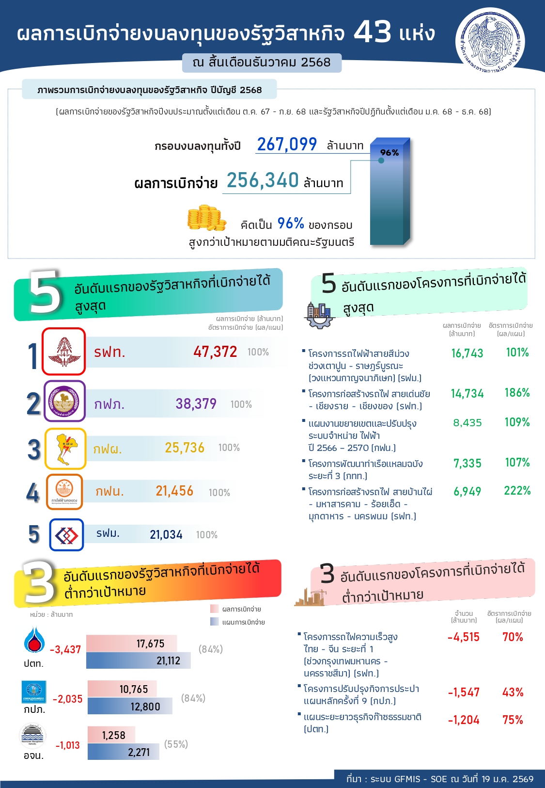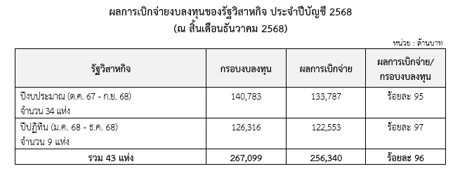 โดยการเบิกจ่ายงบลงทุนของรัฐวิสาหกิจ ประจำปีบัญชี 2568 ที่อยู่ในการติดตามของ สคร. อย่างใกล้ชิด จำนวน 43 แห่ง (รัฐวิสาหกิจปีงบประมาณ 34 แห่ง และรัฐวิสาหกิจปีปฏิทิน 9 แห่ง) มีการเบิกจ่ายงบลงทุนจนถึงสิ้นปีบัญชี 2568 จำนวน 256,340 ล้านบาท หรือคิดเป็นร้อยละ 96 จากกรอบงบลงทุนทั้งสิ้น จำนวน 267,099 ล้านบาท แบ่งเป็นผลการเบิกจ่ายงบลงทุนของรัฐวิสาหกิจปีงบประมาณ (ตั้งแต่เดือนตุลาคม 2567 - เดือนกันยายน 2568) จำนวน 133,787 ล้านบาท หรือร้อยละ 95 ของกรอบงบลงทุน และรัฐวิสาหกิจปีปฏิทิน (เดือนมกราคม 2568 - เดือนธันวาคม 2568) จำนวน 122,553 ล้านบาท หรือร้อยละ 97 ของกรอบงบลงทุน ทั้งนี้ รัฐวิสาหกิจปีงบประมาณที่เบิกจ่ายได้ไม่ต่ำกว่าร้อยละ 95 ของแผนการเบิกจ่ายและมีมูลค่าสูงสุด 3 อันดับ ได้แก่ การรถไฟแห่งประเทศไทย (รฟท.) การรถไฟฟ้าขนส่งมวลชนแห่งประเทศไทย (รฟม.) และการประปานครหลวง (กปน.) และรัฐวิสาหกิจปีปฏิทินที่เบิกจ่ายได้ไม่ต่ำกว่าร้อยละ 95 ของแผนการเบิกจ่ายและมีมูลค่าสูงสุด 3 อันดับ ได้แก่ การไฟฟ้าส่วนภูมิภาค การไฟฟ้าฝ่ายผลิตแห่งประเทศไทย และการไฟฟ้านครหลวง