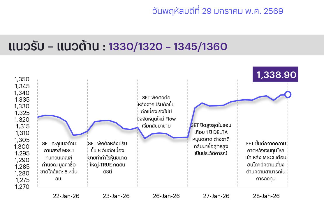 ช่วงสั้นมอง SET แกว่งตัวในกรอบ 1,270–1,360 จุด ปัจจัยในประเทศติดตามการไหลเข้าของ Fund Flow หลังกลับมาซื้อสุทธิในสัปดาห์ก่อน, การทยอยประกาศผลประกอบการ 4Q68 ของหุ้น Real Sector, นโยบายหาเสียงด้านเศรษฐกิจของพรรคการเมืองซึ่งจะมีผลต่ออุตสาหกรรมและหุ้นที่เกี่ยวข้อง ส่วนปัจจัยภายนอกติดตามความไม่แน่นอนเชิงนโยบายของ ปธน. ทรัมป์ ที่มีต่อต่างประเทศ (ตะวันออกกลาง, ยุโรปและจีน) ซึ่งมีผลต่อบรรยากาศการลงทุนในสินทรัพย์เสี่ยง ขณะที่ผลการประชุมนโยบายการเงินของเฟดมีมติคงดอกเบี้ยตามตลาดคาดและยังไม่ได้ส่งสัญญาณการปรับลดดอกเบี้ยในอนาคต ดังนั้นกลยุทธ์การลงทุนจึงแนะนำ “Selective Buy”