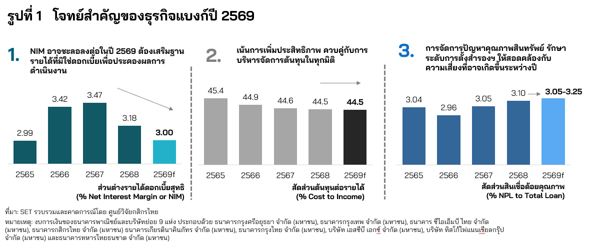 - การกระจายแหล่งรายได้ โดยเฉพาะรายได้ที่มิใช่ดอกเบี้ย เพื่อชดเชยผลกระทบจากรายได้ดอกเบี้ยสุทธิซึ่งยังคงเผชิญแรงกดดันต่อเนื่องในปี 2569 จากดอกเบี้ยที่มีโอกาสปรับลดลงและสินเชื่อที่ฟื้นตัวช้าตามภาวะเศรษฐกิจ ทั้งนี้ ศูนย์วิจัยกสิกรไทยคาดว่า ผลตอบแทน