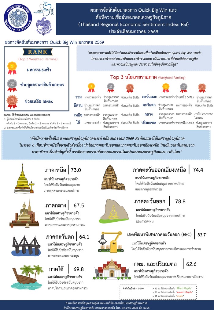 “ดัชนีความเชื่อมั่นอนาคตเศรษฐกิจภูมิภาคประจำเดือนมกราคม 2569 สะท้อนแนวโน้มเศรษฐกิจภูมิภาคในระยะ 6 เดือนข้างหน้าที่ขยายตัวต่อเนื่อง นำโดยภาคตะวันออกและภาคตะวันออกเฉียงเหนือ โดยมีแรงสนับสนุนจากภาคบริการเป็นสำคัญ ทั้งนี้ ควรติดตามความชัดเจนของความไม่แน่นอนของเศรษฐกิจและการค้าโลก นอกจากนี้ กระทรวงการคลังได้สำรวจพิเศษประเมินนโยบาย Quick Big Win พบว่า โครงการมหกรรมธงฟ้าเยียวยาลดค่าครองชีพฯ มาตรการช่วยดูแลราคาสินค้าเกษตร และมาตรการสนับสนุน SMEs ส่งผลดีต่อเศรษฐกิจและประชาชนมากที่สุด”