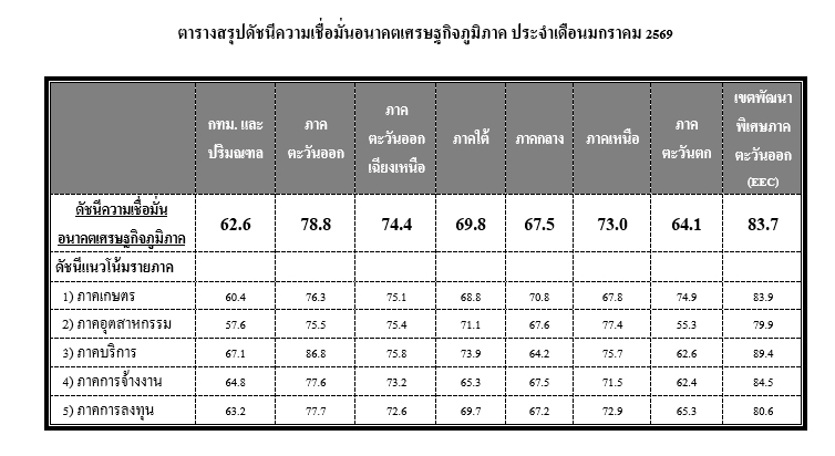 ดัชนีความเชื่อมั่นอนาคตเศรษฐกิจภาคตะวันออกอยู่ที่ระดับ 78.8 สะท้อนถึงความเชื่อมั่นอนาคตเศรษฐกิจที่ขยายตัวได้ โดยเฉพาะในภาคบริการและภาคการลงทุน จากการประชาสัมพันธ์การท่องเที่ยวที่มีต่อเนื่องและการดำเนินมาตรการส่งเสริมและพัฒนาแหล่งท่องเที่ยวจากภาครัฐและเอกชน รวมถึงการพัฒนาโครงสร้างพื้นฐานด้านการคมนาคมทางบกระหว่างจังหวัดในพื้นที่อุตสาหกรรมและแหล่งท่องเที่ยว ส่งผลให้ดัชนีความเชื่อมั่นอนาคตเศรษฐกิจในเขตพัฒนาพิเศษภาคตะวันออก (EEC) ที่อยู่ที่ระดับ 83.7 ขณะเดียวกันดัชนีความเชื่อมั่นอนาคตเศรษฐกิจภาคตะวันออกเฉียงเหนืออยู่ที่ระดับ 74.4 โดยมีแรงสนับสนุนหลักจากภาคบริการและภาคอุตสาหกรรม จากการจัดกิจกรรมส่งเสริมการท่องเที่ยวอย่างต่อเนื่อง ตามแนวโน้มการขยายตัวของธุรกิจไมซ์ (Meetings, Incentive Travel, Conventions และ Exhibitions: MICE) และการเดินทางเข้ามาของนักธุรกิจและหน่วยงานที่เกี่ยวข้องเพื่อจัดเตรียมงานมหกรรมพืชสวนโลก พ.ศ. 2569 ประกอบกับอุปสงค์สินค้าอุตสาหกรรมโดยเฉพาะอุตสาหกรรมเกษตรแปรรูปที่มีต่อเนื่อง ดัชนีความเชื่อมั่นอนาคตเศรษฐกิจภาคเหนืออยู่ที่ระดับ 73.0 โดยมีปัจจัยบวกจากภาคอุตสาหกรรมและภาคบริการ ตามทิศทางการฟื้นตัวของเศรษฐกิจไทย รวมถึงความคืบหน้าของโครงการพัฒนาโครงสร้างพื้นฐาน การยกระดับอุตสาหกรรมไปสู่การผลิตมูลค่าสูง ตลอดจนการเตรียมพร้อมรับการพัฒนาเป็นส่วนหนึ่งของระเบียงเศรษฐกิจพิเศษภาคเหนือ (Northern Economy Corridor: NEC) สำหรับดัชนีความเชื่อมั่นอนาคตเศรษฐกิจภาคใต้อยู่ที่ระดับ 69.8 โดยมีแรงขับเคลื่อนหลักจากภาคบริการและภาคอุตสาหกรรม จากการจัดกิจกรรมส่งเสริมการท่องเที่ยวจากภาครัฐและเอกชนในหลายพื้นที่ โดยเฉพาะในช่วงฤดูการท่องเที่ยวของทะเลฝั่งอ่าวไทยในระหว่างเดือนกุมภาพันธ์-เดือนกันยายน ประกอบกับคำสั่งซื้อสินค้าอุตสาหกรรมที่มีแนวโน้มเพิ่มขึ้นต่อเนื่อง และคาดว่า รัฐบาลชุดใหม่จะมีนโยบายกระตุ้นเศรษฐกิจเพิ่มเติม อย่างไรก็ตาม ควรติดตามประเด็นความแปรปรวนของสภาพอากาศที่อาจส่งผลกระทบต่อภาคการท่องเที่ยวและภาคเกษตร พฤติกรรมของการใช้จ่ายของนักท่องเที่ยวต่างชาติที่มีความระมัดระวังมากขึ้น ซึ่งอาจเป็นปัจจัยกดดันรายได้ภาคบริการ รวมถึงต้นทุนการผลิตที่ยังอยู่ในระดับสูง และความไม่แน่นอนทางเศรษฐกิจ การค้าโลก และสถานการณ์การเมืองภายในประเทศ ดัชนีความเชื่อมั่นอนาคตเศรษฐกิจภาคกลางอยู่ที่ระดับ 67.5 โดยมีแรงสนับสนุนจากภาคเกษตร ตามการส่งออกสินค้าเกษตรที่ขยายตัวได้ดีต่อเนื่อง ซึ่งส่วนหนึ่งเป็นผลจากการปรับลดอัตราภา