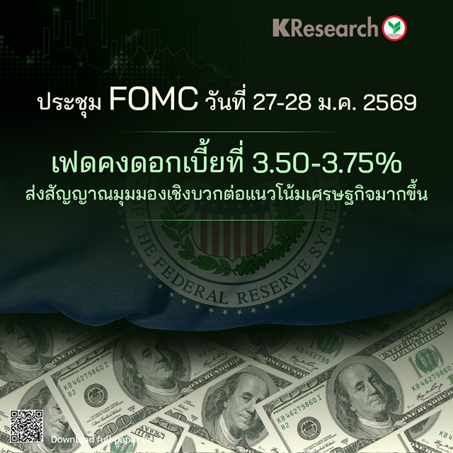 ศูนย์วิจัยกสิกรไทยประเมินว่าจากการส่งสัญญาณของเฟด เฟดมีแนวโน้มหยุดพักการปรับลดดอกเบี้ย และเลื่อนการลดดอกเบี้ยออกไปเป็นช่วงกลางปีเป็นต้นไป เนื่องจากเศรษฐกิจสหรัฐฯ ในช่วงครึ่งแรกของปีมีแนวโน้มยังได้รับแรงหนุนจากการใช้จ่ายของครัวเรือนรายได้สูง ท่ามกลางภาวะตลาดการเงินที่ปรับตัวดีขึ้น การลงทุนด้าน AI ที่ยังขยายตัวต่อเนื่อง รวมถึงเม็ดเงินคืนภาษีจากมาตรการลดภาษีภายใต้รัฐบาลทรัมป์ ขณะที่เงินเฟ้อสหรัฐฯ มีแนวโน้มลดลงเข้าใกล้เป้าหมาย 2% ของเฟดอย่างค่อยเป็นค่อยไป โดยผลกระทบจากการปรับขึ้นภาษีนำเข้าและนโยบายการย้ายถิ่นที่เข้มงวดขึ้นจะยังเป็นปัจจัยที่ส่งผลให้เงินเฟ้อยังคาอยู่ในระดับสูง ท่ามกลางความเสี่ยงจากการปรับขึ้นภาษีนำเข้าเพิ่มเติมที่ยังมีอยู่