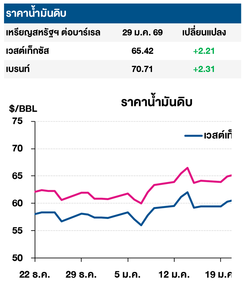 (+) ราคาน้ำมันดิบเวสต์เท็กซัสและเบรนท์ปรับเพิ่มขึ้น หลังตลาดกังวลว่าอุปทานน้ำมันโลกอาจถูกจำกัด หากสหรัฐฯ โจมตีอิหร่านซึ่งเป็นหนึ่งในผู้ผลิตน้ำมันรายใหญ่ของกลุ่ม OPEC โดยมีรายงานว่าประธานาธิบดีสหรัฐฯ นายโดนัลด์ ทรัมป์ กำลังพิจารณทางเลือกต่ออิหร่าน ซึ่งรวมถึงการพุ่งเป้าโจมตีกองกำลังความมั่นคงและผู้นำของอิหร่าน เพื่อสร้างเงื่อนไขต่อการเปลี่ยนแปลงทางการเมืองในอิหร่าน ขณะเดียวกันทางการอิหร่านได้ออกประกาศแจ้งเตือนเกี่ยวกับแผนการซ้อมรบทางทะเลของกองทัพด้วยกระสุนจริงในช่องแคบฮอร์มุซในวันที่ 1-2 ก.พ. 69 นี้ โดยนักวิเคราะห์ระบุว่าความกังวลหลักของตลาดคือความเสี่ยงที่อิหร่าน อาจตอบโต้ประเทศเพื่อนบ้าน หรืออาจปิดช่องแคบฮอร์มุซซึ่งมีน้ำมัน ราว 20 ล้านบาร์เรลต่อวันลำเลียงผ่าน