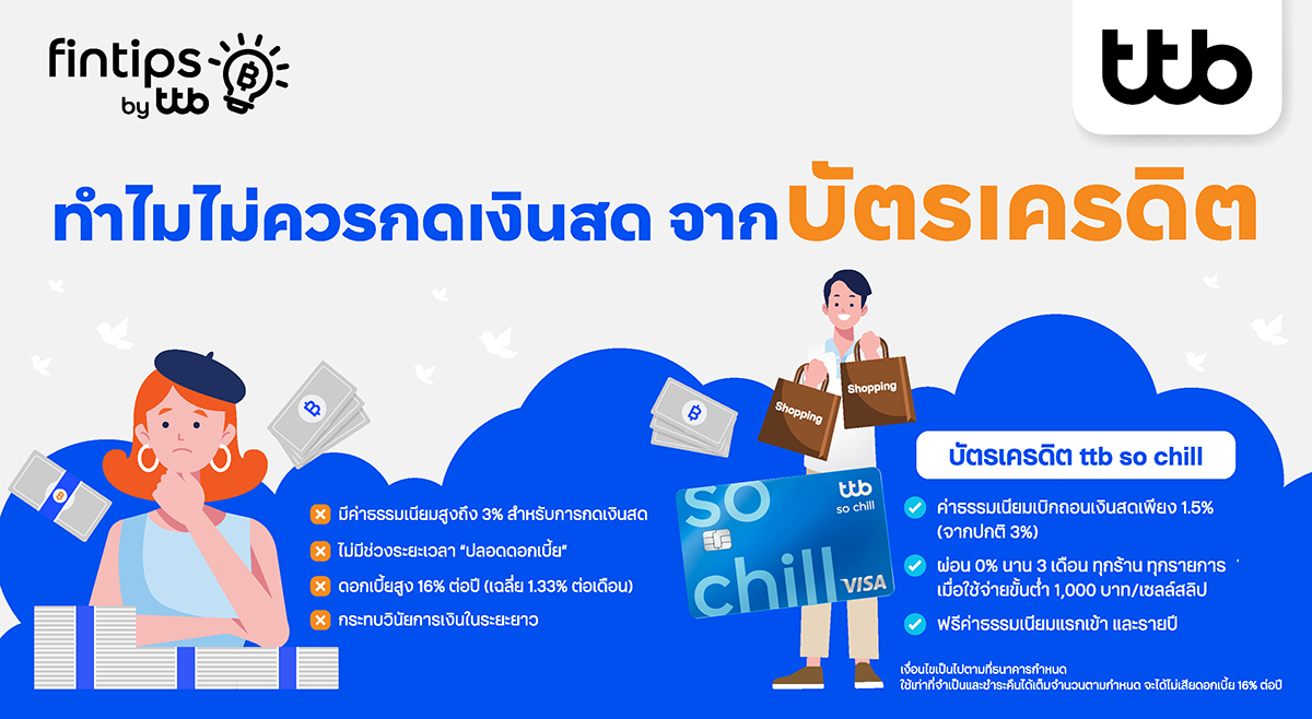 คลิกเพื่ออ่านบทความฉบับเต็มได้ที่ https://www.ttbbank.com/th/fin-tips/detail/creditcard-avoid-cash-advance-on-creditcard หรือ ติดตามเคล็ดลับการเงินอื่น ๆ จาก “fintips by ttb” เรื่องเงินที่รู้จริงแบบเพื่อนที่รู้ใจ คลิก https://www.ttbbank.com/link/fintips-pr