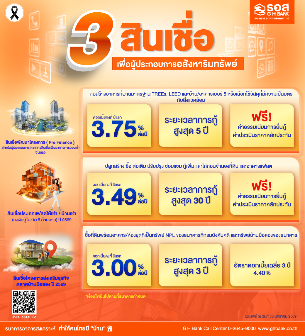 ธนาคารอาคารสงเคราะห์ (ธอส.) ร่วมขับเคลื่อนเศรษฐกิจผ่านภาคอสังหาริมทรัพย์และเพิ่มโอกาสให้คนไทยเข้าถึงที่อยู่อาศัยมากขึ้น จัดทำสินเชื่อเพื่อผู้ประกอบการ ปี 2569 ทั้งการพัฒนาโครงการใหม่ ต่อยอดธุรกิจเพื่อสร้างรายได้ และการพัฒนาโครงการที่เป็นมิตรต่อสิ่งแวดล้อม ในอัตราดอกเบี้ยพิเศษ ประกอบด้วย