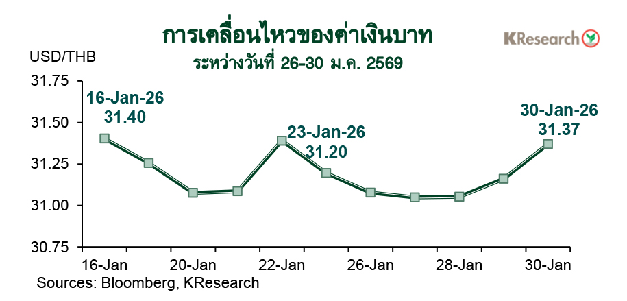 อนึ่ง กระทรวงการคลังสหรัฐฯ ได้เปิดเผยรายงานเรื่องนโยบายเศรษฐกิจมหภาคและอัตราแลกเปลี่ยนของคู่ค้าสำคัญของสหรัฐฯ เมื่อวันที่ 29 ม.ค. 2569 ซึ่งในรายงานฉบับนี้ไทยถูกเพิ่มชื่อเข้าไปอยู่ในกลุ่มติดตามใกล้ชิด (Monitoring list) ร่วมกับญี่ปุ่น จีน เยอรมนี ไอร์แลนด์ สิงคโปร์ เกาหลีใต้ สวิตเซอร์แลนด์ ไต้หวันและเวียดนาม อย่างไรก็ดี ปัจจัยนี้ยังไม่มีผลมากนักต่อการเคลื่อนไหวของเงินบาทในช่วงปลายสัปดาห์