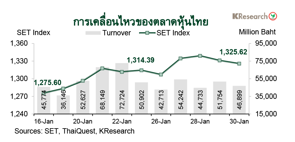 · ในวันศุกร์ที่ 30 ม.ค. 2569 ดัชนี SET ปิดที่ระดับ 1,325.62 จุด เพิ่มขึ้น 0.85% จากระดับปลายสัปดาห์ก่อน ขณะที่มูลค่าการซื้อขายเฉลี่ยต่อวันอยู่ที่ 48,068.02 ล้านบาท ลดลง 14.33% จากสัปดาห์ก่อน ส่วนดัชนี mai ลดลง 0.88% มาปิดที่ระดับ 209.29 จุด