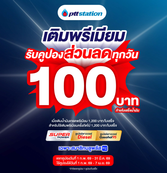 พีทีที สเตชั่น (PTT Station) จัดโปรแรงรับต้นปี 2569 เปิดแคมเปญ "เติมพรีเมียม รับคูปองลด 100 บาท" มอบสิทธิพิเศษให้สมาชิก บลูพลัส (blueplus+) ที่เติมน้ำมันเกรดพรีเมียม Super Power ครบ 1,200 บาทต่อใบเสร็จ รับทันทีคูปองส่วนลดมูลค่า 100 บาท สำหรับใช้เติมน้ำมัน Super Power ในครั้งถัดไป รับสิทธิ์ได้ทุกวัน ตั้งแต่วันที่ 1 กุมภาพันธ์ – 31 มีนาคม 2569
