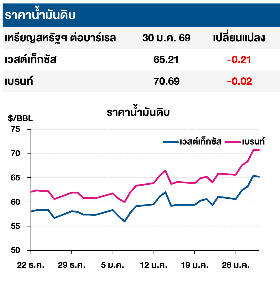 (-) ค่าเงินดอลลาร์สหรัฐฯ ปรับตัวแข็งค่าขึ้น หลังประธานาธิบดีสหรัฐฯ โดนัลด์ ทรัมป์ ประกาศเสนอชื่อ เควิน วอร์ช อดีตผู้ว่าการธนาคารกลางสหรัฐฯ (เฟด) ให้ขึ้นดำรงตำแหน่งประธานเฟดคนต่อไป ถัดจากวาระของ เจอโรม พาวเวล ที่จะสิ้นสุดลงในเดือน พ.ค. 69 ส่งผลให้สัญญาน้ำมันดิบที่กำหนดราคาด้วยสกุลเงินดอลลาร์สหรัฐฯ มีราคาแพงขึ้นสำหรับผู้ซื้อที่ถือครองสกุลเงินอื่น