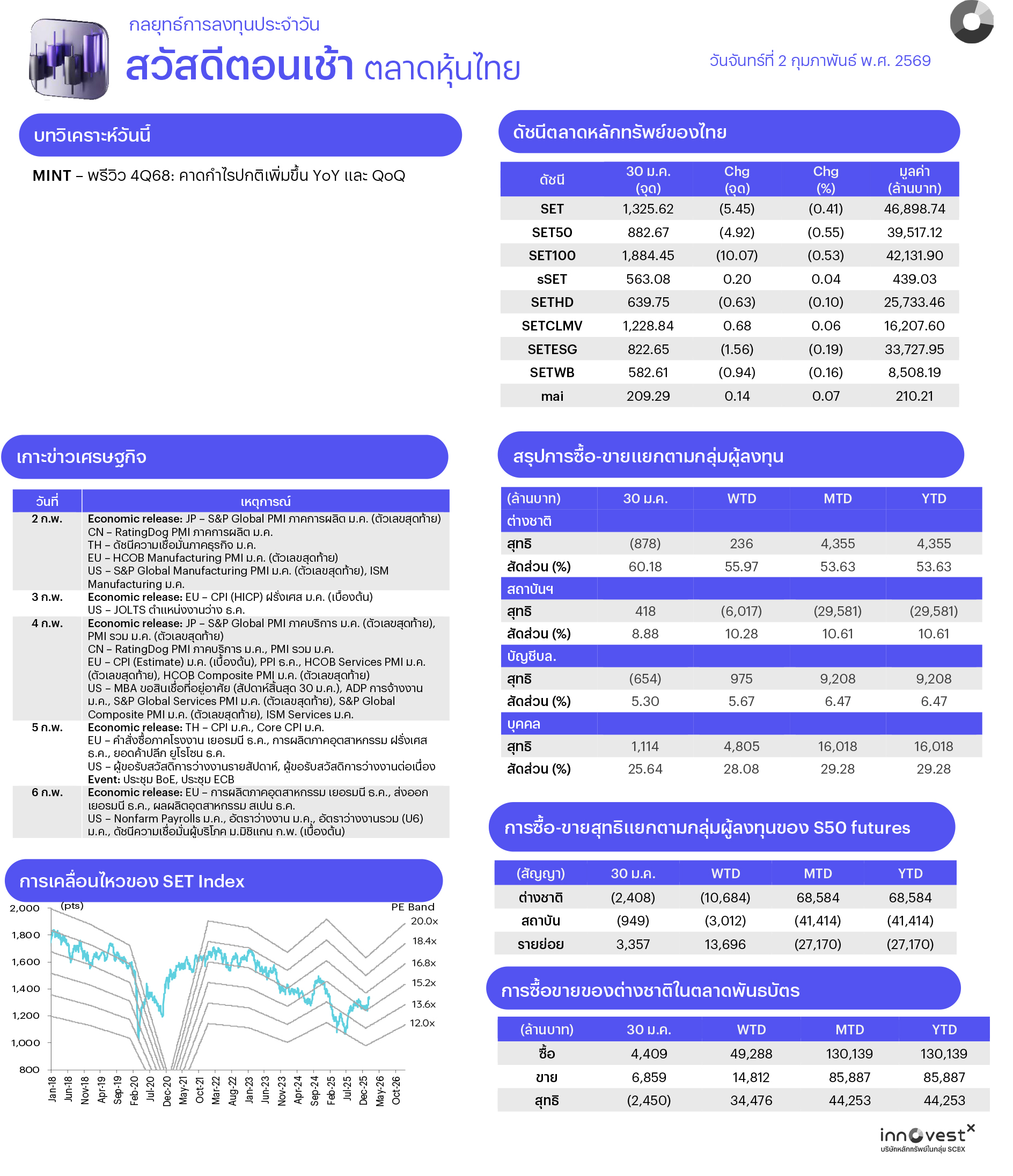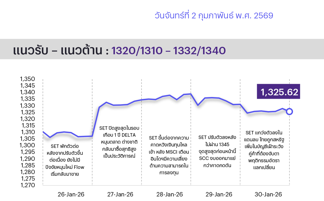 ช่วงสั้นมอง SET แกว่งตัวไซด์เวย์ในกรอบ 1,300–1,380 จุด โดยปัจจัยในประเทศติดตามการเข้าสู่ช่วงโค้งสัปดาห์สุดท้ายในการหาเสียงก่อนการเลือกตั้งวันที่ 8 ก.พ., แนวโน้มการไหลเข้าของ Fund Flow, เงินเฟ้อ ม.ค. ซึ่งตลาดคาดอยู่ในช่วง -0.5% ถึง 0.2% และการประกาศงบ 4Q68 ของหุ้น Real Sectors ส่วนปัจจัยภายนอกติดตามนโยบายกีดกันทางการค้าและภูมิรัฐศาสตร์ของ ปธน. ทรัมป์ ที่มีต่อต่างประเทศ (ทั้งตะวันออกกลาง ยุโรปและจีน) ซึ่งมีผลต่อบรรยากาศการลงทุนในตลาดสินทรัพย์เสี่ยงโลก รวมถึงตัวเลขเศรษฐกิจสำคัญของสหรัฐ อาทิ การจ้างงานและ PMI ภาคการผลิต ขณะที่การประชุมนโยบายการเงินชอง ECB และ BoE ในวันที่ 5 ก.พ. ตลาดคาดมีมติคงดอกเบี้ยนโยบาย ดังนั้นกลยุทธ์การลงทุนจึงแนะนำ “Selective Buy”