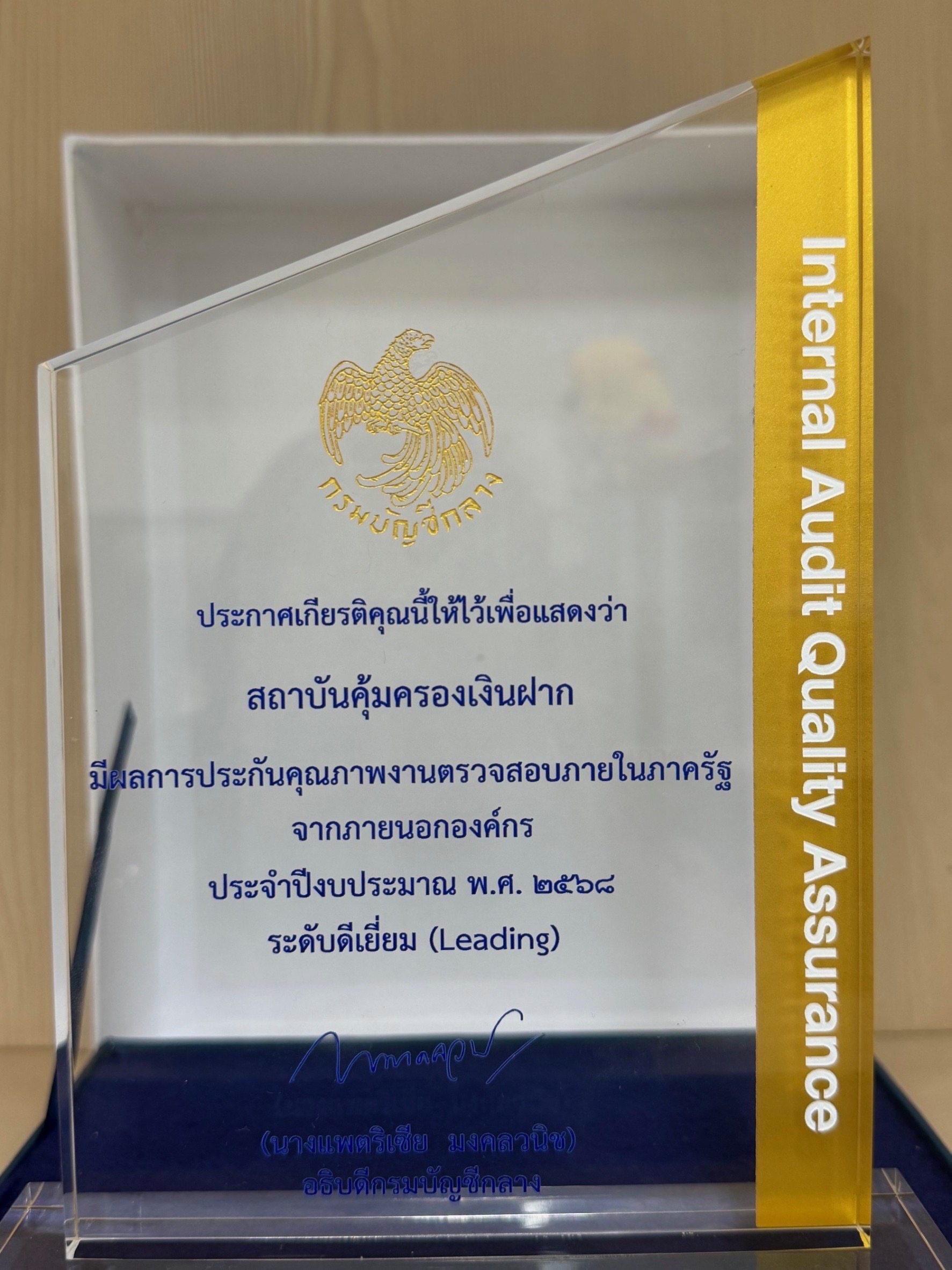 นางปิยาภรณ์ โพธิ์กลิ่น รองผู้อำนวยการ รักษาการแทนผู้อำนวยการสถาบันคุ้มครองเงินฝาก ได้เข้ารับมอบประกาศเกียรติคุณจากอธิบดีกรมบัญชีกลาง เพื่อยกย่องเชิดชูเกียรติสถาบันคุ้มครองเงินฝาก ในฐานะหน่วยงานภาครัฐที่มีศักยภาพและความเข้มแข็งด้านการตรวจสอบภายใน