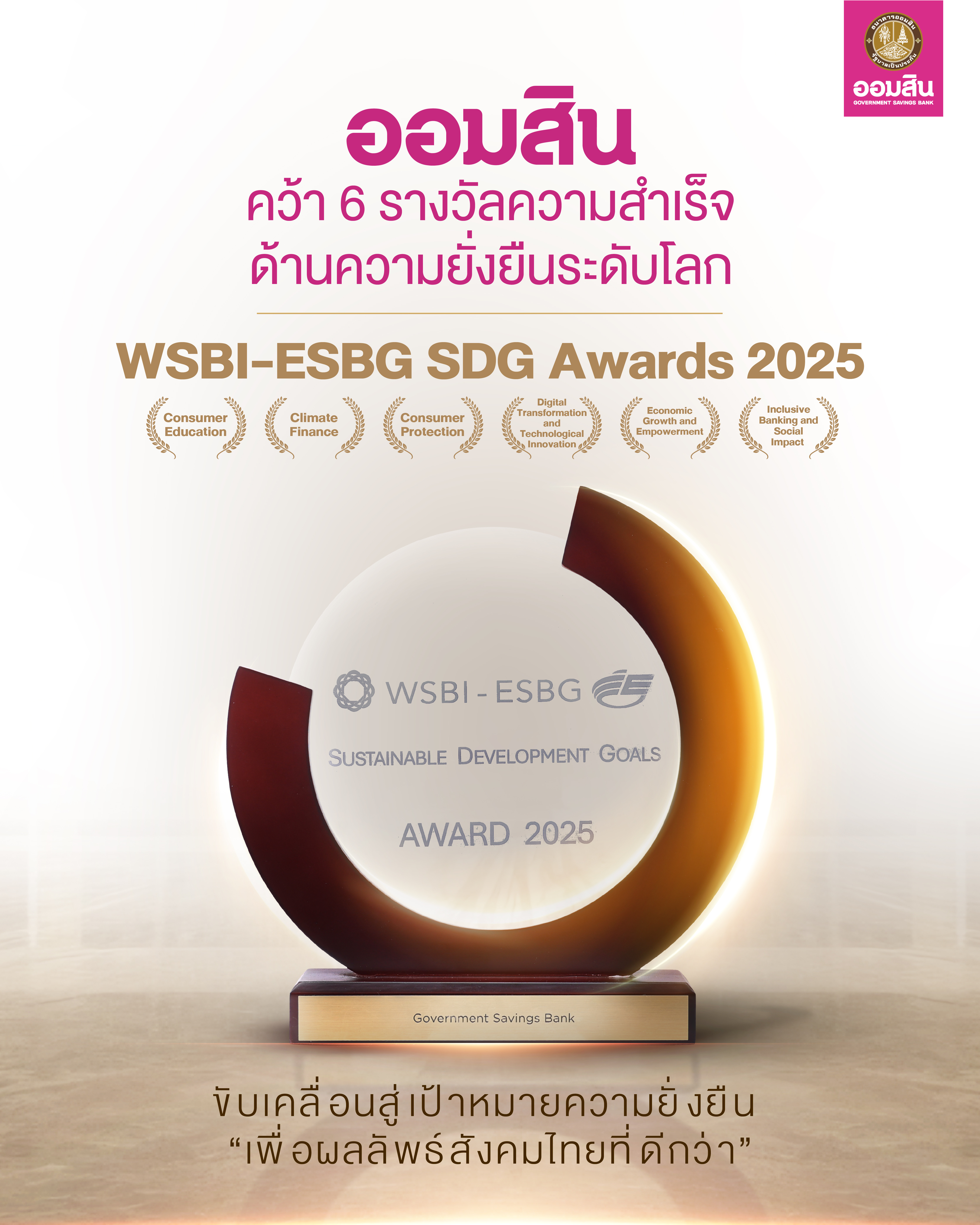 รางวัล WSBI SDG Awards 2025 ถือเป็นบทพิสูจน์ความสำเร็จของธนาคารออมสินในการขับเคลื่อนการสร้าง Social Impact อย่างเป็นระบบ ครอบคลุมตั้งแต่มิติการเสริมสร้างความรู้ทางการเงิน การพัฒนาเศรษฐกิจชุมชน การเงินดิจิทัล การสนับสนุนการดำเนินธุรกิจตามแนวทาง ESG ไปจนถึงการคุ้มครองผู้บริโภค สอดคล้องกับจุดยืนการเป็นธนาคารเพื่อสังคมอย่างยั่งยืนในระดับสากล