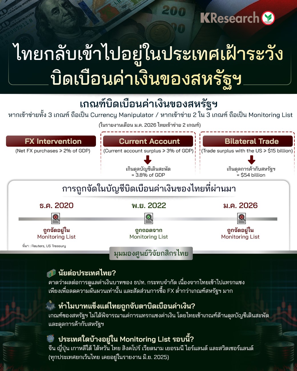 • ไทยกลับเข้าสู่ประเทศเฝ้าระวังบิดเบือนค่าเงินของสหรัฐฯ อีกครั้งในเดือนม.ค. 2026 ที่ผ่านมา แม้ค่าเงินบาทแข็งค่า เนื่องจากเข้าข่าย 2 ใน 3 เกณฑ์ ด้านการเกินดุลบัญชีเดินสะพัดและดุลการค้ากับสหรัฐฯ ขณะที่ ด้านการเข้าซื้อ FX ยังคงต่ำกว่าเกณฑ์