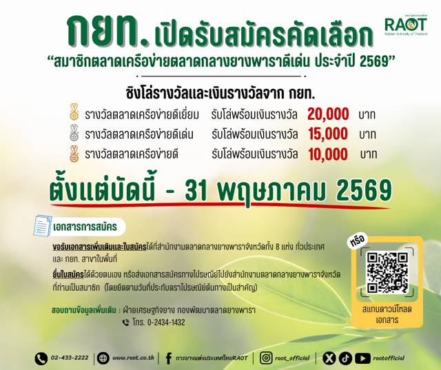 การยางแห่งประเทศไทย (กยท.) โดยฝ่ายเศรษฐกิจยาง เปิดรับสมัครคัดเลือก "สมาชิกตลาดเครือข่ายตลาดกลางยางพาราดีเด่น ประจำปี 2569" ชวนเครือข่ายตลาดยางพารากว่า 500 แห่ง ทั่วประเทศ เข้าประชันศักยภาพ ดันตลาดยางเครือข่ายสู่ตลาดยุคใหม่ที่มีประสิทธิภาพ โปร่งใส เป็นธรรม เป็นมิตรต่อสิ่งแวดล้อม สมัครได้ตั้งแต่วันนี้ - 31 พฤษภาคม 2569