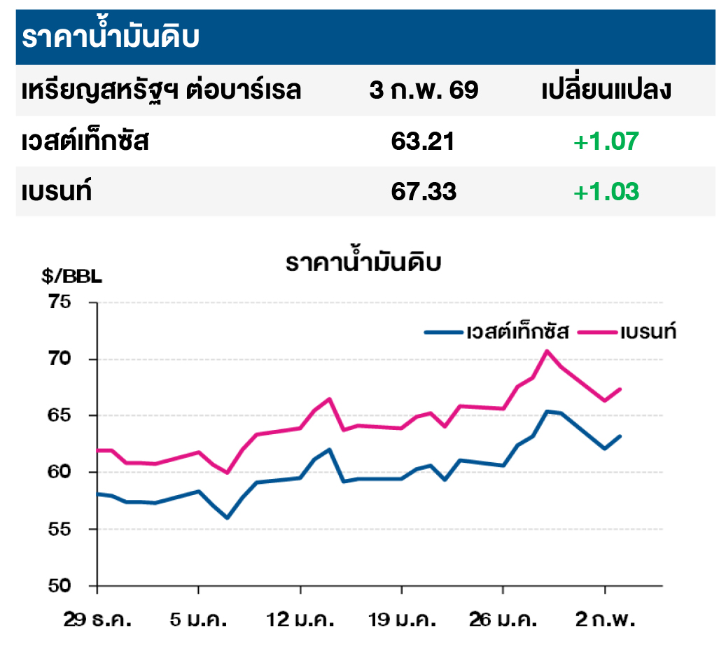 (-) ตลาดคาดการณ์ปริมาณน้ำมันดิบจากคาซัคสถานมีแนวโน้มปรับเพิ่มสูงขึ้น หลังการกลับมาดำเนินการผลิตน้ำมันดิบจากแหล่งน้ำมันดิบเทงกิซ โดยปริมาณการผลิตฟื้นตัวขึ้นเกือบแตะระดับ 20% ของกำลังการผลิต หลังต้องหยุดการผลิตชั่วคราวจากเหตุเพลิงไหม้ในช่วงกลาง ม.ค. 69 ที่ผ่านมา ทั้งนี้ ตลาดคาดว่าคาซัคสถานจะยังคงเพิ่มกำลังการผลิตอย่างต่อเนื่อง ซึ่งอาจแตะระดับ 45% ของกำลังการผลิตในเร็ววันนี้