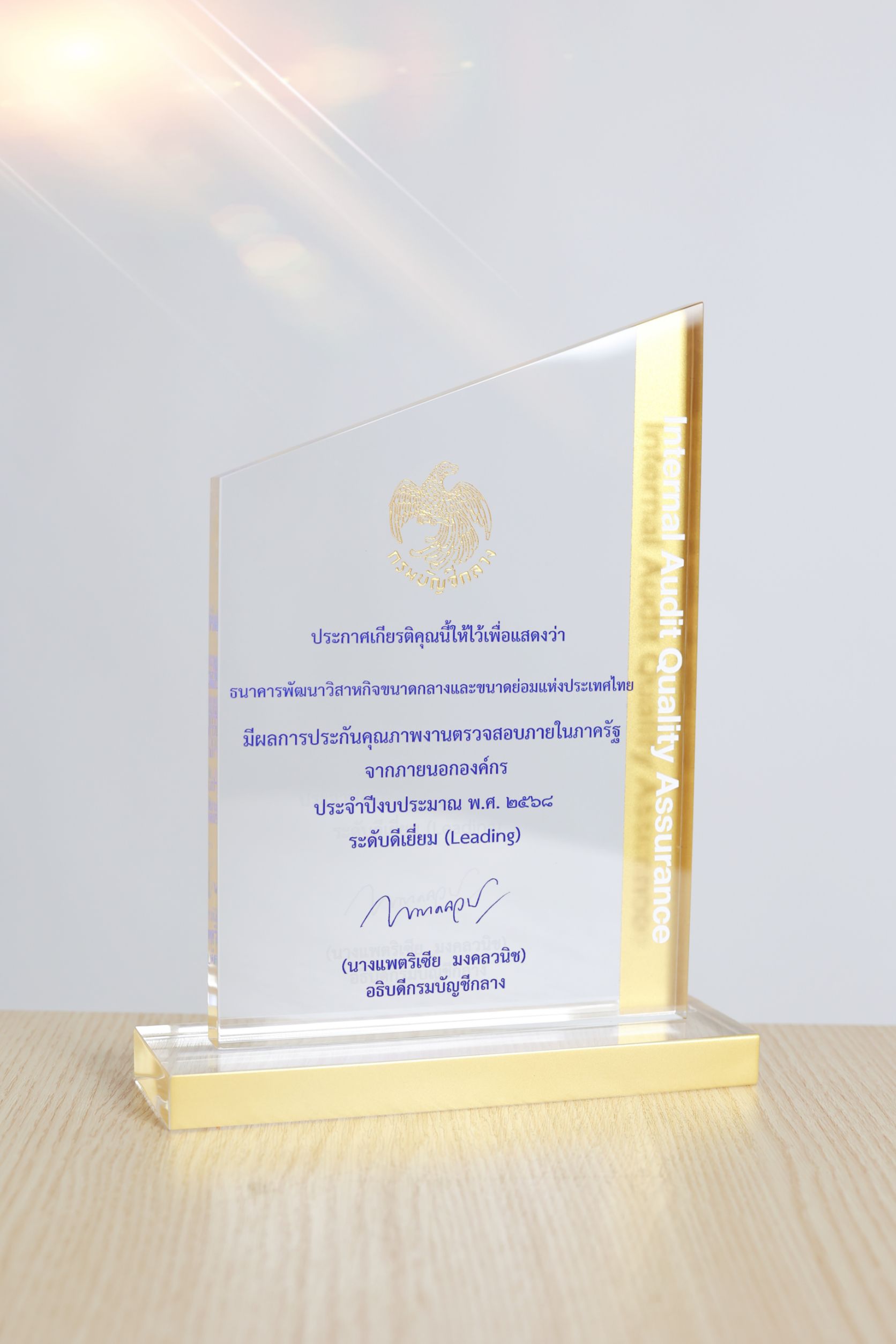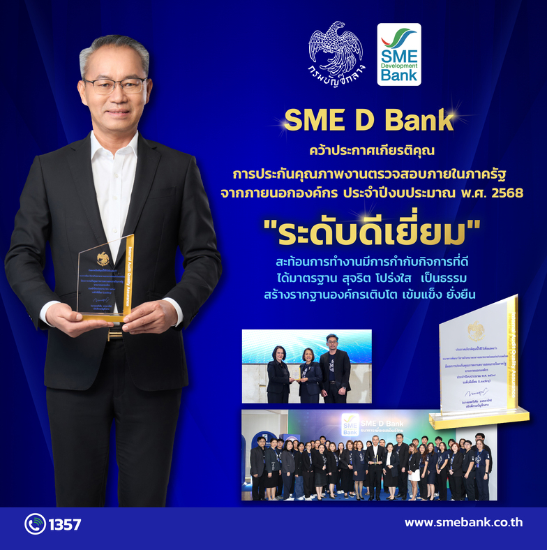 นายพิชิต มิทราวงศ์ กรรมการผู้จัดการ ธนาคารพัฒนาวิสาหกิจขนาดกลางและขนาดย่อมแห่งประเทศ ไทย (ธพว.) หรือ SME D Bank เปิดเผยว่า SME D Bank ได้รับมอบโล่ประกาศเกียรติคุณ "การประกันคุณภาพงานตรวจสอบภายในภาครัฐจากภายนอกองค์กร" (Internal Audit Quality Assurance : IAQA) ประจำปีงบประมาณ พ.ศ. 2568 “ระดับดีเยี่ยม” (Leading) ซึ่งเป็นระดับที่สูงที่สุด จากการประเมินของกรมบัญชีกลาง กระทรวงการคลัง โดยพิจารณาตามกรอบมาตรฐานและหลักเกณฑ์ปฏิบัติการตรวจสอบภายใน สำหรับหน่วยงานของรัฐ ซึ่ง SME D Bank สามารถปฏิบัติงานด้านการตรวจสอบภายใน เป็นไปตามเกณฑ์การประเมินทุกประเด็น สะท้อนถึงการเป็นสถาบันการเงินของรัฐที่มีการกำกับกิจการที่ดี ได้มาตรฐานตามหลักเกณฑ์ปฏิบัติการตรวจสอบภายใน มีความโปร่งใส และเป็นธรรม รวมถึง ให้ความสำคัญต่อการพัฒนางานตรวจสอบภายใน เพื่อส่งเสริมสนับสนุนการดำเนินงานขององค์กรอย่างต่อเนื่อง สร้างรากฐานนำไปสู่การเติบโตอย่างเข้มแข็งและยั่งยืนในอนาคต