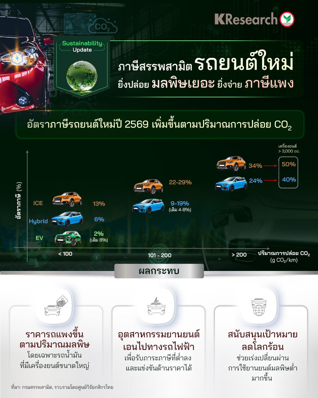 • โดยเป็นผลจากการปรับโครงสร้างภาษีสรรพสามิตรถยนต์ใหม่ ที่เปลี่ยนจากการพิจารณาเพียงขนาดเครื่องยนต์ (cc) มาพิจารณาการปล่อยก๊าซคาร์บอนไดออกไซด์ (CO2) เพิ่มเติม ทำให้อัตราภาษีสรรพสามิตรถยนต์ในกลุ่ม Eco Car จากเดิม 12% ปรับเพิ่มเป็น 13-?34% โดยอัตราภาษีดังกล่าวจะทยอยปรับขึ้นอีก 2 ระยะ ได้แก่ ระหว่างปี 2571-2572 และอีกครั้งในปี 2573