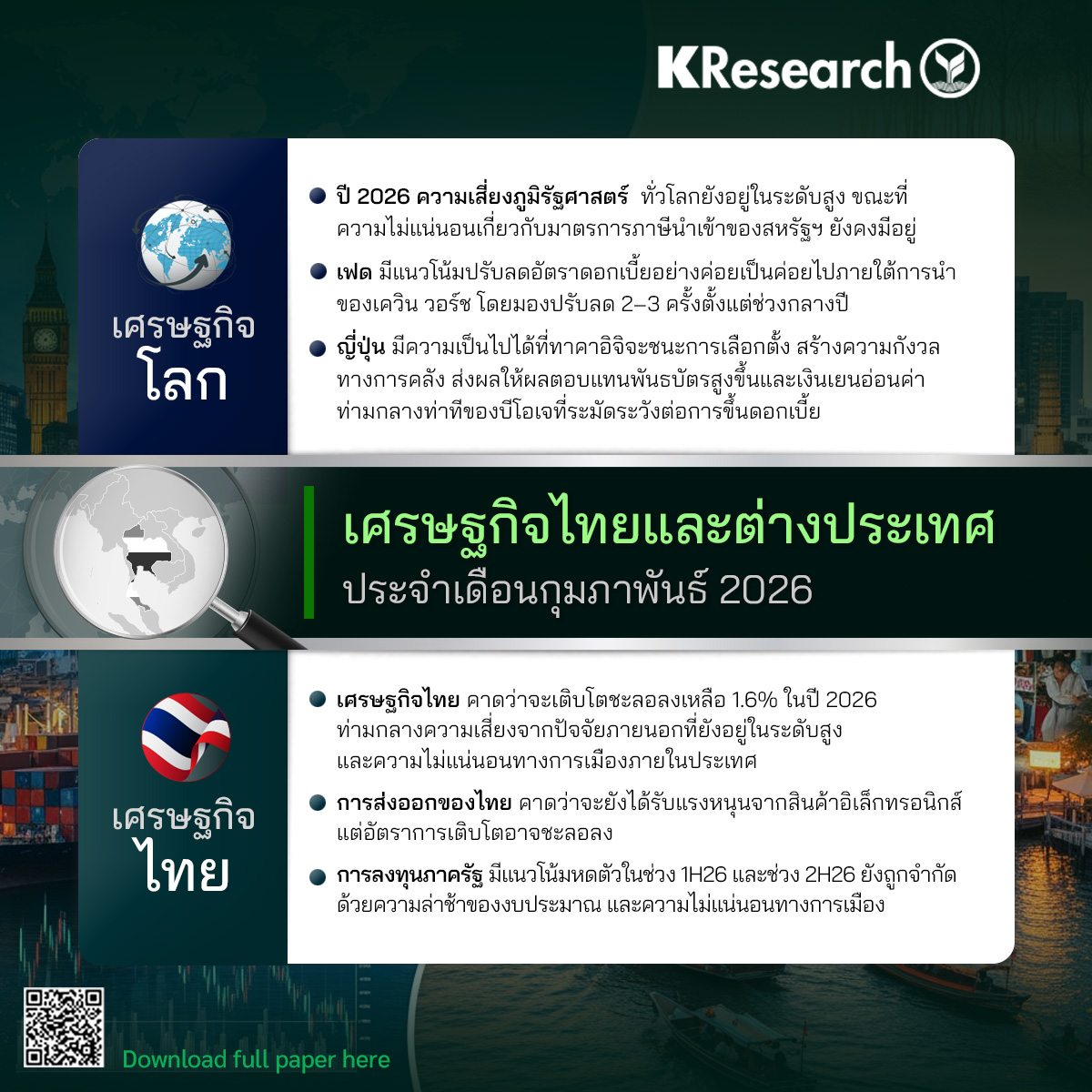 - เศรษฐกิจไทย คาดว่าจะเติบโตชะลอลงเหลือ 1.6% ในปี 2026 ท่ามกลางความเสี่ยงจากปัจจัยภายนอกที่ยังอยู่ในระดับสูง และความไม่แน่นอนทางการเมืองภายในประเทศ