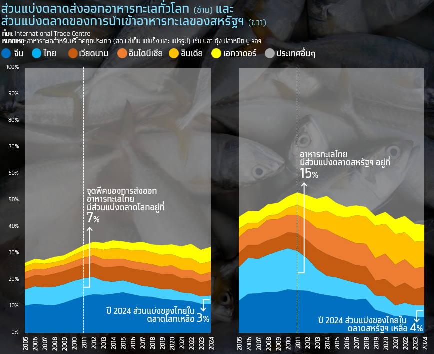 • ช่วงทศวรรษที่ผ่านมาไทยสูญเสียสถานะการเป็นผู้นำด้านการส่งออกอาหารทะเลในตลาดโลกและสหรัฐฯ ให้กับประเทศคู่แข่งอย่างเวียดนาม อินโดนีเซีย อินเดีย และเอกวาดอร์ จากต้นทุนการผลิตของไทยสูงกว่า ตลอดจนปัญหาเรื่องแรงงานผิดกฎหมาย โดยในปี 2024 ไทยมีส่วนแบ่งในตลาดสหรัฐฯ เหลือเพียง 4% (มูลค่า 1.1พันล้านดอลลาร์สหรัฐฯ) จาก 12-15% (มูลค่า 2.1 พันล้านดอลลาร์สหรัฐฯ) ในช่วงปี 2005-2011