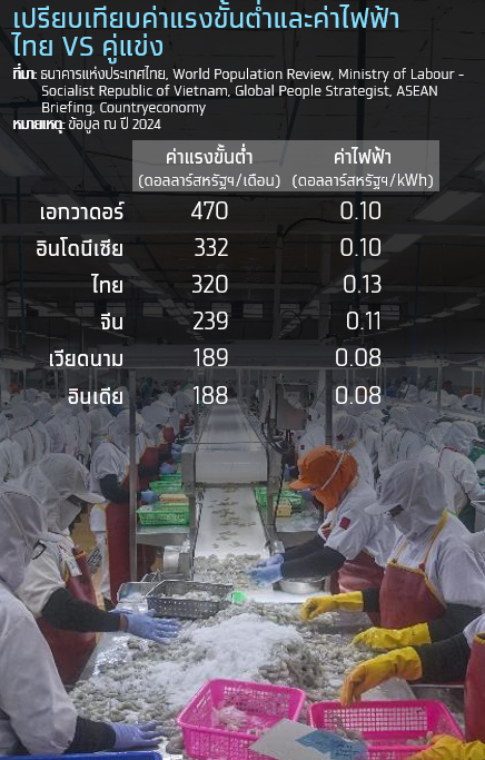 ค่าไฟฟ้าของไทยสูงกว่าคู่แข่งอีก 5 ประเทศอย่างชัดเจน ในปี 2024 ค่าไฟฟ้าของไทยเฉลี่ยอยู่ที่ 0.13 ดอลลาร์สหรัฐฯ/kWh สูงกว่าอินเดียและเวียดนามที่มีค่าเฉลี่ยเพียง 0.08 ดอลลาร์สหรัฐฯ/kWh หรือสูงกว่าถึง 63% เนื่องจากไฟฟ้าเป็นปัจจัยที่สำคัญในการเพาะเลี้ยงสัตว์น้ำ เช่น การใช้เครื่องตีน้ำเพื่อเติมออกซิเจน ส่วนต่างของค่าไฟฟ้านี้จึงกระทบโดยตรงต่อต้นทุนการผลิต ทำให้สินค้าไทยมีต้นทุนที่สูงกว่าคู่แข่งตั้งแต่ต้นน้ำ