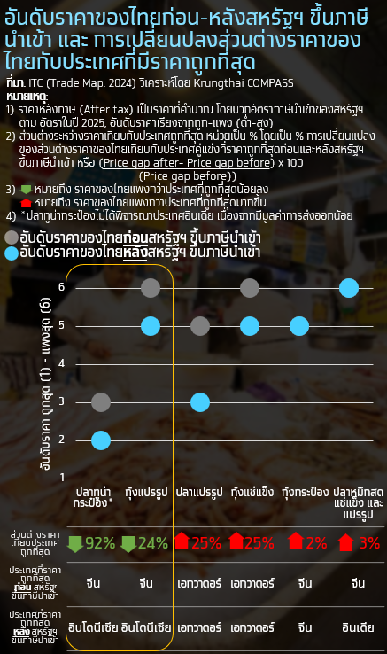 กุ้งแปรรูป: เดิมราคากุ้งแปรรูปของไทยอยู่ลำดับสุดท้ายของกลุ่ม (แพงที่สุด) แต่หลังการเพิ่มภาษีนำเข้าของสหรัฐฯ ราคาของไทยขยับอันดับจากอันดับ 6 ขึ้นมาเป็นอันดับ 5 จากการที่อินเดียตกลงมาเป็นลำดับสุดท้ายของกลุ่ม อีกทั้งราคาส่วนต่างระหว่างไทยกับประเทศที่มีราคาถูกที่สุดในกลุ่มหลังการเพิ่มภาษีนั้นลดลง 24%