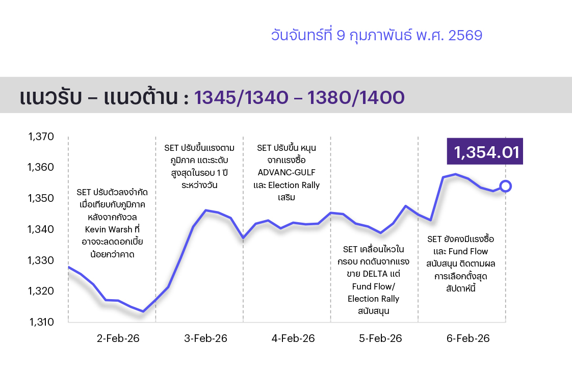 ช่วงสั้นมอง SET จะตอบสนองเชิงบวก (Bullish) และมีโอกาสปรับขึ้นไปทดสอบ 1400 หลังผลคะแนนเลือกตั้งไทยอย่างไม่เป็นทางการพบว่าพรรคภูมิใจไทยมีคะแนนนำเป็นอันดับหนึ่งทำให้มีโอกาสสูงที่จะเป็นแกนนำจัดตั้งรัฐบาลใหม่ โดยคาดกระบวนการจัดตั้งรัฐบาลจะเกิดขึ้นได้เร็วและมีความต่อเนื่องของการดำเนินนโยบาย ส่วนปัจจัยอื่นที่ต้องติดตาม ได้แก่ การประกาศงบ 4Q68 ของหุ้น Real Sectors, นโยบาย ปธน. ทรัมป์ ที่มีต่อต่างประเทศ (ทั้งตะวันออกกลาง ยุโรปและจีน) ซึ่งมีผลต่อบรรยากาศการลงทุนในตลาดสินทรัพย์เสี่ยงโลก รวมถึงตัวเลขเศรษฐกิจสำคัญของสหรัฐฯ อาทิ ตัวเลขจ้างงาน, ยอดค้าปลีก และ CPI ซึ่งแม้คาดจะยังไม่เปลี่ยนมุมมองเรื่องดอกเบี้ยสหรัฐฯ แต่เป็นปัจจัยที่ตลาดให้ความสนใจ ดังนั้นกลยุทธ์การลงทุนจึงแนะนำ “Selective Buy”