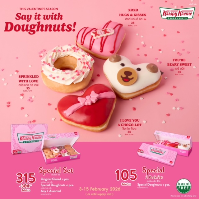 มอบโดนัทเป็นตัวแทนสื่อรักแทนใจในเทศกาลแห่งความรักนี้ด้วย “Krispy Kreme THIS VALENTINE'S SEASON Say it with Doughnuts” ในราคาเพียง ชิ้นละ 35 บาท หรือจะเลือกซื้อแบบเซตที่มาพร้อมกล่องลายลิมิเต็ดทั้งแบบแพ็ก 3 ในราคา 105 บาท (วาเลนไทน์ โดนัท 3 ชิ้น) หรือแบบเซต ในราคาเพียง 315 บาท (วาเลนไทน์ โดนัท 4 ชิ้น, แอสซอร์ทเตท 2 ชิ้น และออริจินอล เกลซ 6 ชิ้น) ตั้งแต่วันที่ 3 – 15 กุมภาพันธ์ 2569 ณ ร้านคริสปี้ ครีม ทุกสาขาใกล้บ้านคุณ (ราคาดังกล่าว ยกเว้น สาขาสนามบินสุวรรณภูมิ, สนามบินดอนเมือง และแอปพลิเคชัน ฟู้ดดิลิเวอรี)