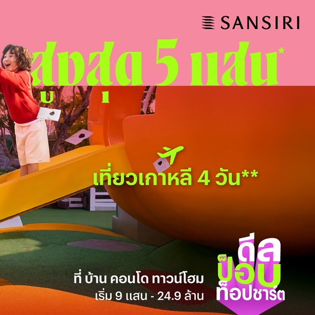 แสนสิริ ยกระดับความหวานให้พุ่งทะลุชาร์ตต้อนรับเทศกาลวาเลนไทน์ ด้วยโปรโมชันสุดร้อนแรง "DEAL POP TOP CHART แซ่บถึงโซล" มอบของขวัญชิ้นใหญ่เป็นส่วนลด On-Top ทันทีสูงสุดถึง 500,000 บาท* เพื่อช่วยให้การมีบ้านในฝันเป็นเรื่องง่ายมากขึ้น ไม่ว่าจะเป็นบ้านหลังแรกของคนโสด หรือบ้านหลังสำคัญสำหรับคู่รักที่กำลังเริ่มต้นบทใหม่ร่วมกัน และพิเศษยิ่งกว่ากับสิทธิ์ลุ้นทริปบินลัดฟ้าสัมผัสบรรยากาศสุดโรแมนติก หรือไปชมคอนเสิร์ตศิลปินวงโปรดที่กรุงโซล ประเทศเกาหลีใต้ 4 วัน 3 คืน จำนวน 5 รางวัล รวมมูลค่ากว่า 375,000 บาท* สำหรับผู้ที่จองซื้อบ้าน ทาวน์โฮม และคอนโดมิเนียมของแสนสิริ ภายในวันที่ 13 – 15 กุมภาพันธ์ 2569 นี้เท่านั้น