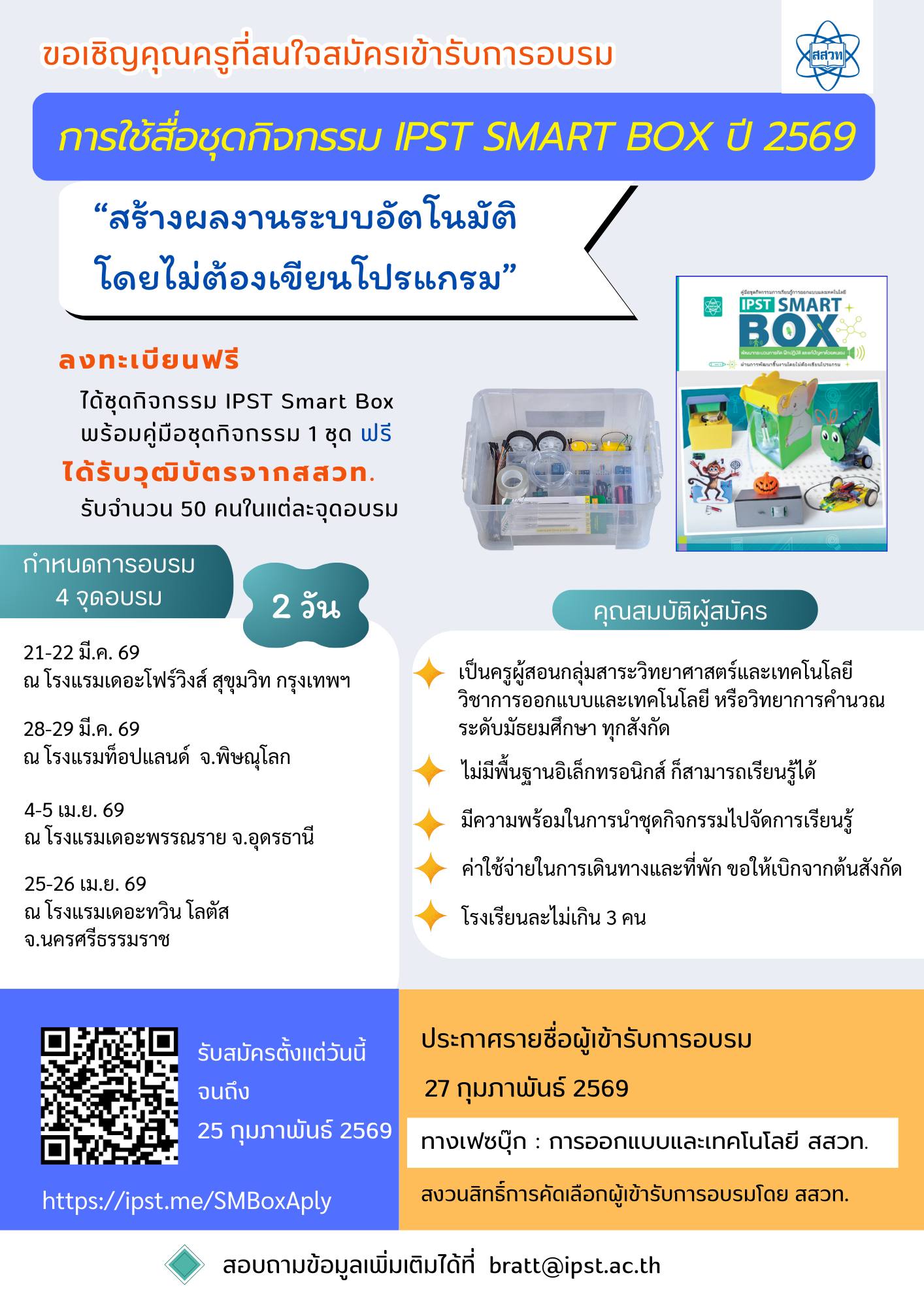 สถาบันส่งเสริมการสอนวิทยาศาสตร์และเทคโนโลยี (สสวท.) ขอเชิญครูผู้สอนกลุ่มสาระวิทยาศาสตร์และเทคโนโลยี วิชาการออกแบบและเทคโนโลยี หรือวิทยาการคำนวณ ระดับมัธยมศึกษา สมัครเข้ารับการอบรมการใช้สื่อชุดกิจกรรม IPST SMART BOX ปี 2569 "สร้างผลงานระบบอัตโนมัติโดยไม่ต้องเขียนโปรแกรม" อบรมฟรี ระยะเวลา 2 วัน พร้อมรับชุดอุปกรณ์ IPST SMART BOX และคู่มือคนละ 1 ชุด ฟรี รวมถึงวุฒิบัตรจาก สสวท. รับจำนวนจำกัด 50 คน โรงเรียนละไม่เกิน 3 คน โดยจัดอบรม ในวันที่ 21–22 มี.ค. 69 จ. กรุงเทพฯ, 28–29 มี.ค. 69 จ. พิษณุโลก, 4–5 เม.ย. 69 จ. อุดรธานี และ 25–26 เม.ย. 69 จ. นครศรีธรรมราช เปิดรับสมัครตั้งแต่วันนี้ถึง 25 ก.พ. 2569 สนใจสมัครออนไลน์ได้ที่ลิงก์ https://ipst.me/SMBoxAply ประกาศรายชื่อผู้ได้รับคัดเลือกวันที่ 27 ก.พ. 2569 ทางเฟซบุ๊ก “การออกแบบและเทคโนโลยี สสวท.” สอบถามเพิ่มเติมที่อีเมล bratt@ipst.ac.th