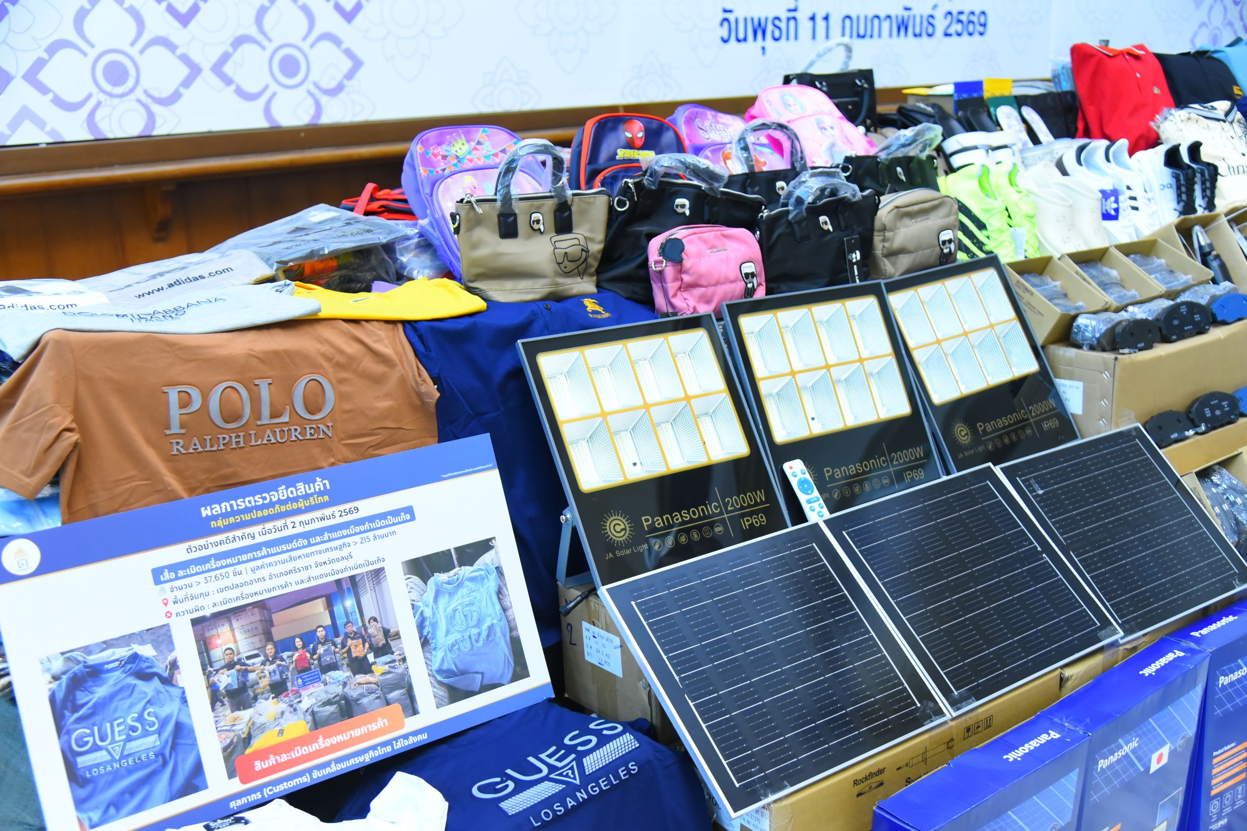 4. วันที่ 2 กุมภาพันธ์ 2569 กองสืบสวนและปราบปราม ได้ทำการอายัดสินค้า ณ เขตปลอดอากรแห่งหนึ่ง ในอำเภอศรีราชา จังหวัดชลบุรี ต้นทางจากประเทศเวียดนาม ใช้สิทธิประโยชน์เขตปลอดอากร ผลการตรวจสอบ พบเสื้อละเมิดเครื่องหมายการค้า จำนวน 34,400 ตัว และเสื้อที่สำแดงเมืองกำเนิดเป็นเท็จ จำนวน 3,250 ตัว มูลค่าความเสียหายทางเศรษฐกิจ 215 ล้านบาท