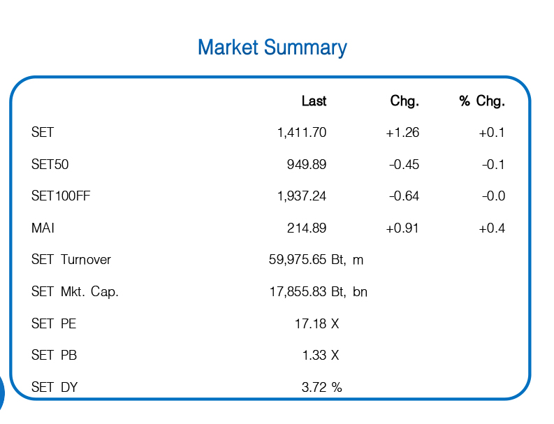 ประคองตัวแดนบวก – SET แกว่งอิงแดนบวกเล็กน้อยในกรอบ 1408-18 ปิดบวกอ่อนๆ 4 วันติดจากแรงซื้อหุ้นกลุ่มค้าปลีกและ DELTA แต่มีแรงขายทำกำไรหุ้นที่ขึ้นแรงช่วงก่อนหน้าถ่วงดัชนี อาทิ ADVANC, AOT, THAI และกลุ่ม BANK ต่างชาติซื้อสุทธิ 1.08 พันลบ. 7 วันติด และพลิก Long S50 Futures 3,087 สัญญา ยุติ Short 2 วันติด
