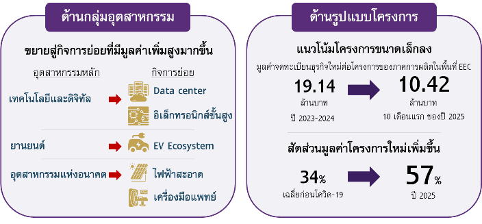 นอกจากนี้ การเปลี่ยนผ่านสู่ยุคอุตสาหกรรมใหม่ยังเป็นความท้าทายสำคัญที่ผู้ประกอบการต้องเตรียมพร้อม อาทิ 1) แนวโน้มการผลิตที่มุ่งสู่เทคโนโลยีขั้นสูงมากขึ้น เช่น EV, Semiconductor, Biotech และ Data center ซึ่งต้องการสาธารณูปโภคที่มีคุณภาพสูงและเสถียรภาพ ทั้งระบบไฟฟ้า น้ำ และโครงข่าย Fiber Optic 2) มาตรฐานความยั่งยืน ที่ผลักดันให้เกิดความต้องการบริการรูปแบบใหม่ ทั้งการเข้าถึงพลังงานสะอาด การบริหารจัดการน้ำที่ลดการรบกวนแหล่งน้ำธรรมชาติ และระบบจัดการขยะที่ปราศจากการฝังกลบ และ 3) การเตรียมความพร้อมรองรับการเข้ามาลงทุนมากขึ้นของ Hyperscale data center ที่ต้องการโครงสร้างพื้นฐานที่มีความมั่นคงสูงสุดและที่ดินที่ปลอดภัยจากภัยพิบัติ อย่างไรก็ดี การปรับนโยบายภาครัฐที่ให้สิทธิประโยชน์ทางภาษีสำหรับการลงทุน Data center ในพื้นที่นอก EEC ที่สูงกว่า อาจส่งผลให้ความต้องการที่ดินนอก EEC เพิ่มขึ้น ดังนั้น ผู้ประกอบการนิคมอุตสาหกรรมจึงต้องเตรียมความพร้อมด้วยการยกระดับบริการสาธารณูปโภคและโครงสร้างพื้นฐานให้มีเสถียรภาพสูงสุด ควบคู่กับการสนับสนุนให้โรงงานภายในนิคมฯ สามารถเข้าถึงแหล่งพลังงานสะอาดได้อย่างสะดวกและมีประสิทธิภาพตามความต้องการของอุตสาหกรรมยุคใหม่ในระยะข้างหน้า