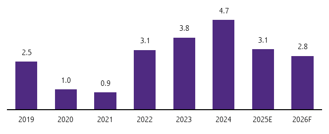 ความต้องการโรงงานสำเร็จรูปให้เช่ายังมีแนวโน้มขยายตัวต่อเนื่อง โดยคาดว่าพื้นที่ที่มีสัญญาเช่าจะเพิ่มขึ้นราว 60,000 ตร.ม. จากการลงทุนในโครงการขนาดเล็กที่เพิ่มมากขึ้น ซึ่งการเช่าโรงงานสำเร็จรูปจะช่วยลดต้นทุนการก่อสร้างโรงงานและสามารถเริ่มต้นการผลิตได้อย่างรวดเร็ว ขณะที่การเปิดพื้นที่เช่าใหม่เข้าสู่ตลาดคาดว่าจะอยู่ที่ราว 120,000 ตร.ม. ซึ่งแม้จะชะลอตัวจากปี 2568 ที่มีการเร่งขยายพื้นที่รองรับการกระจายฐานการผลิตของต่างชาติ แต่ปริมาณดังกล่าวยังเป็นไปตามแผนการขยายพื้นที่ของผู้ประกอบการ เพื่อเติมเต็มพื้นที่ว่างที่ลดลงในช่วงปี 2567-2568