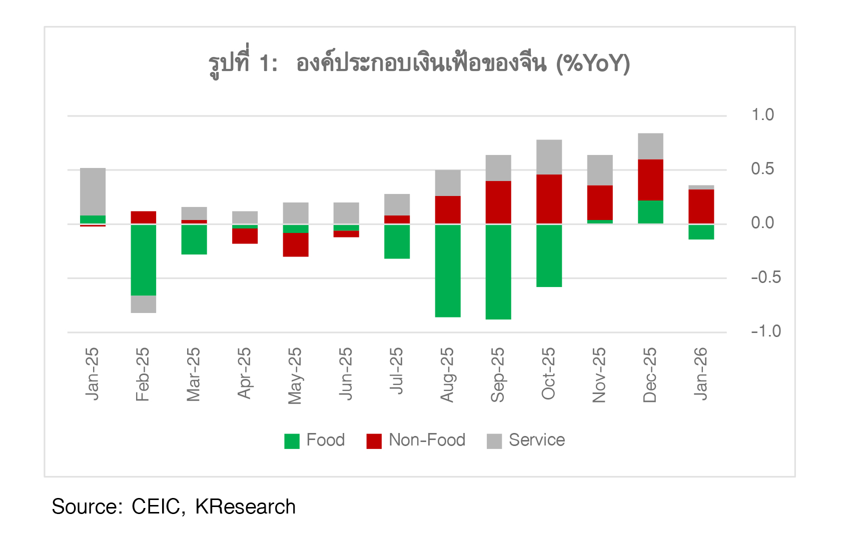 เดือนม.ค. 2569 เงินเฟ้อจีนโตชะลอลงอยู่ที่ 0.2%YoY จาก 0.8%YoY ในเดือนธ.ค.68 (รูปที่ 1) ได้รับปัจจัยกดดันจากราคาอาหารที่หดตัวอยู่ที่ -0.2%YoY นอกจากนี้เงินเฟ้อในส่วนของภาคบริการยังเติบโตชะลอลง โดยส่วนหนึ่งคาดเป็นผลจากฐานที่สูงในปีก่อน เนื่องจากเทศกาลวันตรุษจีนปีก่อนมีขึ้นในเดือนม.ค.68 แต่ปีนี้อยู่ในช่วงกลางเดือนก.พ.69 ขณะที่เงินเฟ้อพื้นฐานชะลอลงเล็กน้อยอยู่ที่ 0.8%YoY จาก 1.2%YoY ในเดือนธ.ค.68
