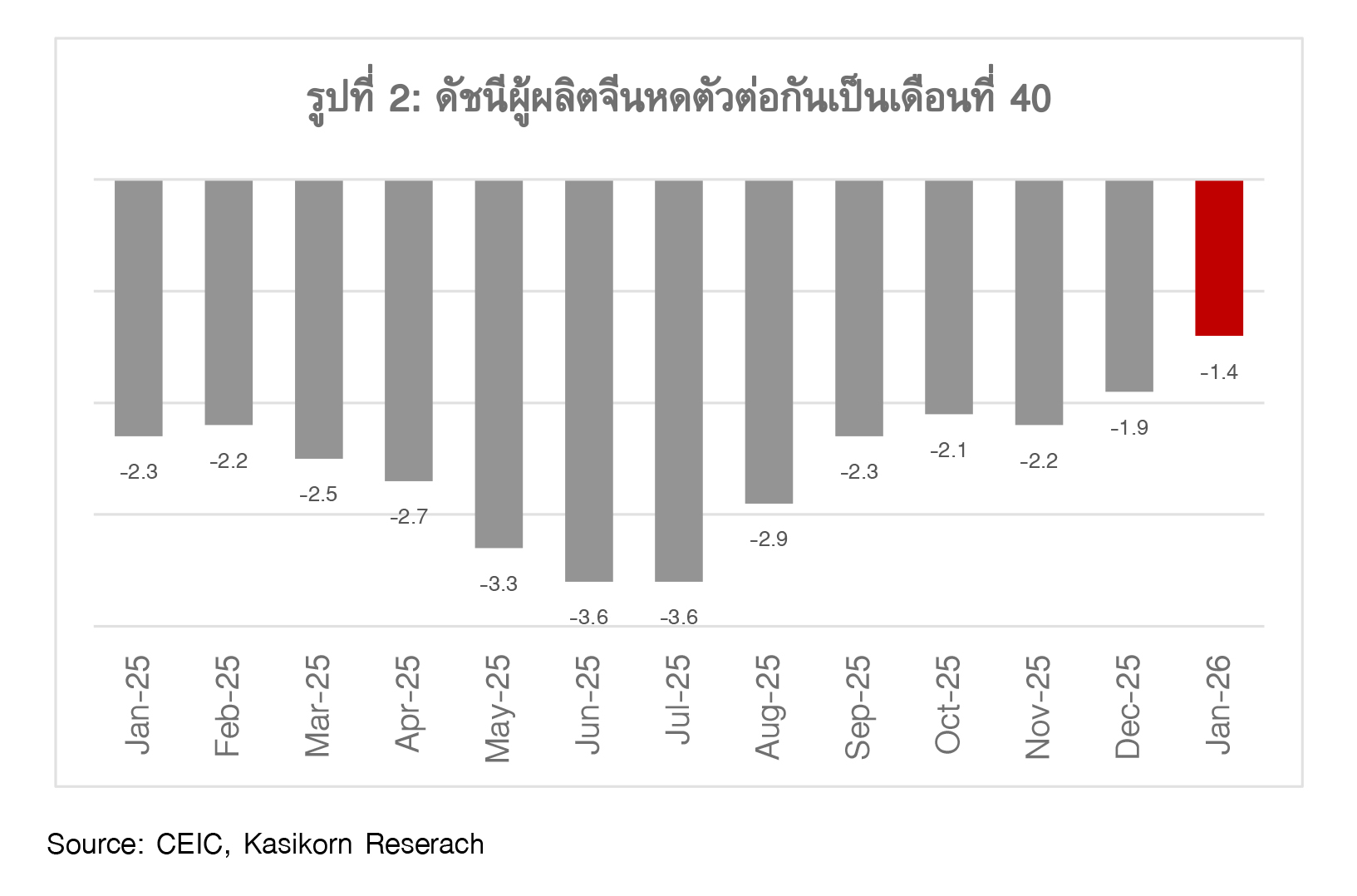 ดัชนีราคาผู้ผลิต (PPI) ยังหดตัวต่อเนื่องติดต่อกันเป็นเดือนที่ 40 อยู่ที่ -1.4%YoY (รูปที่ 2) แต่ชะลอการหดตัวลงจากปัจจัยด้านราคาสินค้าโภคภัณฑ์โลกที่ปรับตัวสูงขึ้น ขณะที่ดัชนีราคาผู้ผลิตในส่วนของสินค้าผู้บริโภค (Consumer goods) เช่น อาหาร เสื้อผ้า ยังหดตัวเพิ่มขึ้นอยู่ที่ -1.7%YoY จาก -1.3%YoY ในเดือนธ.ค.68 สะท้อนถึงราคาสินค้าผู้บริโภคที่ยังมีแนวโน้มหดตัวเพิ่มขึ้น ซึ่งคาดว่าการส่งผ่านสินค้าราคาถูกจากจีนไปต่างประเทศ รวมถึงไทยยังมีอยู่ โดยพิจารณา Trade Index ในส่วนของราคา (Unit value) ในเดือนธ.ค.2568 ยังปรับลดลง -3.6%YoY