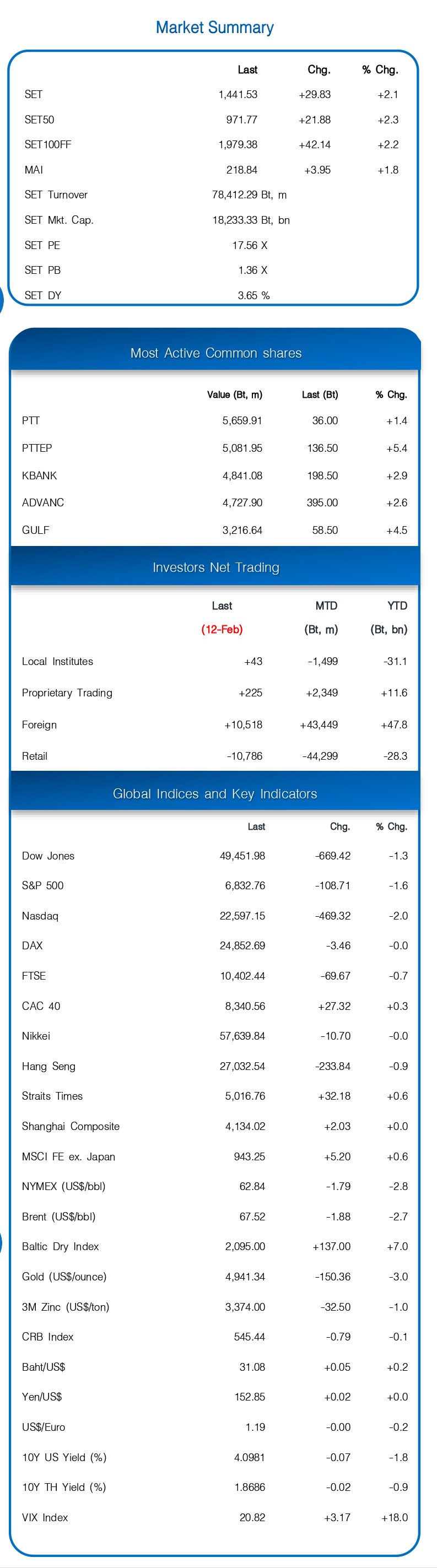 ชะลอตัว – แม้ทิศทางเงินทุนต่างชาติยังเป็นบวกแต่ SET ขึ้นมาเร็ว เฉพาะสัปดาห์นี้ขึ้นมาเกือบ 100 จุดแล้วเสี่ยงพักตัว-สร้างฐานจากสัญญาณเทคนิคอยู่ในภาวะ Overbought ประกอบกับสัปดาห์หน้าเข้าสู่เทศกาลตรุษจีน, จับตางบ แนวรับ 1430 แนวต้าน 1455-60
