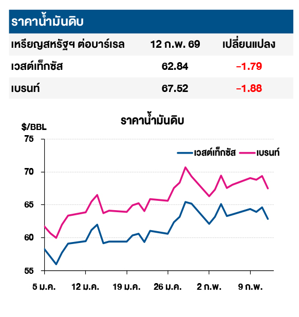 (-) ราคาน้ำมันดิบเวสต์เท็กซัสและเบรนท์ปรับลดลง หลังรายงานของสำนักงานพลังงานระหว่างประเทศ (IEA) เผยว่าการเติบโตของอุปสงค์น้ำมันโลกในปี 2569 อยู่ที่ระดับ 0.85 ล้านบาร์เรลต่อวัน ต่ำกว่ารายงานครั้งก่อนหน้าที่ระดับ 0.93 ล้านบาร์เรลต่อวัน หลังเศรษฐกิจโลกยังคงเผชิญกับความไม่แน่นอนจากการดำเนินมาตรการภาษีของรัฐบาลสหรัฐฯ นอกจากนี้รายงานยังเผยว่าสต๊อกน้ำมันดิบปรับเพิ่มขึ้นกว่า 477 ล้านบาร์เรล ในปี 2568 โดยเป็นผลมาจากอุปทานที่ปรับเพิ่มขึ้นอย่างต่อเนื่องจากการยกเลิกมาตรการปรับลดกำลังการผลิตของกลุ่มโอเปกพลัส (OPEC+)