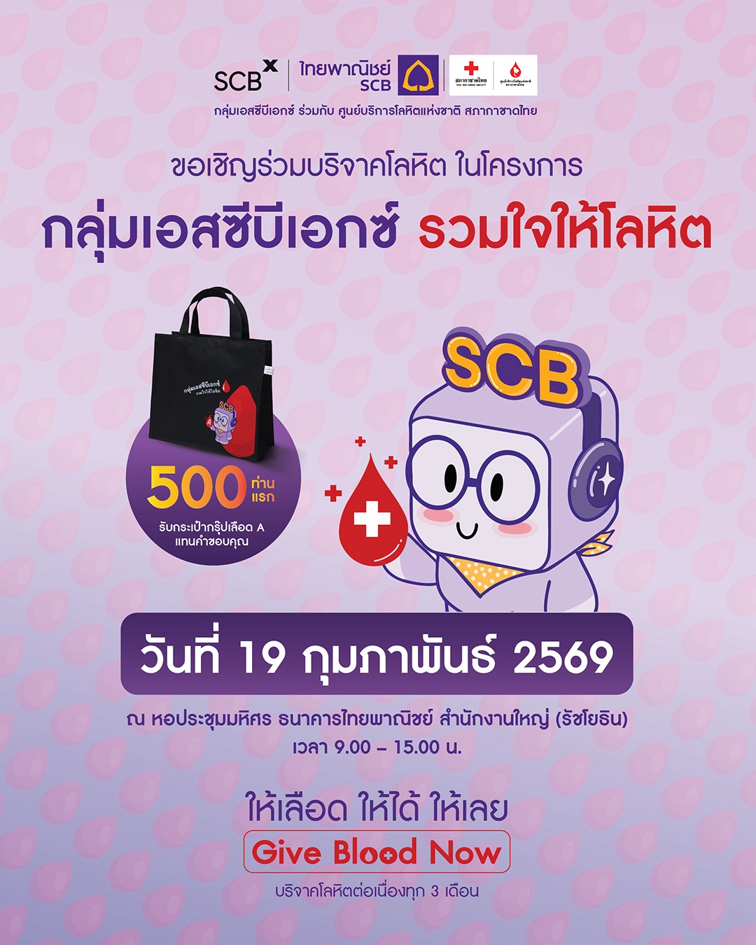 กลุ่มเอสซีบีเอกซ์ โดยธนาคารไทยพาณิชย์ ร่วมกับ ศูนย์บริการโลหิตแห่งชาติ สภากาชาดไทย ขอเชิญร่วมบริจาคโลหิต เติมเต็มปริมาณโลหิตสำรองคงคลัง ภายใต้โครงการ “กลุ่มเอสซีบีเอกซ์ รวมใจให้โลหิต” ในวันพฤหัสบดีที่ 19 กุมภาพันธ์ 2569 เวลา 9.00-15.00 น. ณ หอประชุมมหิศร ธนาคารไทยพาณิชย์ สำนักงานใหญ่ (รัชโยธิน) เพื่อส่งต่อโลหิตที่มีคุณภาพให้มีเพียงพอต่อการรักษาพยาบาลผู้ป่วยทั่วประเทศ ยังมีผู้ป่วยจำนวนมากที่กำลังรอรับโลหิตเพื่อต่อลมหายใจ “Give Blood Now ให้เลือด ให้ได้ ให้เลย” การบริจาคโลหิต 1 ครั้ง สามารถนำไปช่วยชีวิตผู้ป่วยได้มากกว่า 3 ชีวิต ผู้บริจาคโลหิต 500 ท่านแรก รับ “กระเป๋ากรุ๊ปเลือด A” แทนคำขอบคุณ