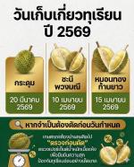 โดยคาดว่าจะเริ่มทยอยเก็บเกี่ยวทุเรียนพันธุ์กระดุมได้ตั้งแต่วันที่ 20 มีนาคม 2569 พันธุ์ชะนีและพวงมณีตั้งแต่วันที่ 10 เมษายน 2569 และพันธุ์หมอนทองรวมถึงพันธุ์ก้านยาว ตั้งแต่วันที่ 15 เมษายน 2569 เป็นต้นไป ทั้งนี้ หากเกษตรกรมีความจำเป็นต้องเก็บเกี่ยวก่อนวันที่กำหนด ต้องนำผลผลิตเข้ารับการ “ตรวจก่อนตัด” โดยตรวจวัดเปอร์เซ็นต์น้ำหนักเนื้อแห้ง เพื่อยืนยันความสุกของผลผลิต และป้องกันการตัดทุเรียนอ่อนอย่างเด็ดขาด