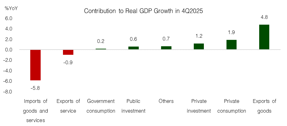 GDP ไตรมาส 4/2568 ขยายตัวสูงกว่าคาดที่ 2.5% และสูงกว่าที่ KResearch ประเมินไว้ที่ 0.8%YoY ในขณะที่ Consensus อยู่ที่ 1.3% YoY โดยมีประเด็นดังนี้