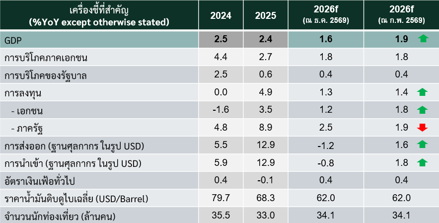 เศรษฐกิจไทยไตรมาส 4/2568 ขยายตัวเร่งขึ้นจากไตรมาสก่อนหน้ามาอยู่ที่ 2.5% YoY และพลิกกลับมาขยายตัวเมื่อเทียบกับไตรมาสก่อนหน้าที่ 1.9% QoQ ส่งผลให้สามารถหลีกเลี่ยงภาวะเศรษฐกิจถดถอยทางเทคนิคได้ และทั้งปี 2568 เศรษฐกิจไทยขยายตัวที่ 2.4% สูงกว่า 2.0% ที่ศูนย์วิจัยกสิกรไทยคาดไว้ก่อนหน้านี้