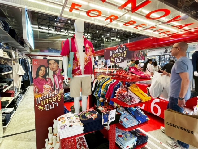 ส่วนร้าน GQ จัดดิสเพลย์ธีม “แดงมั่งมี เศรษฐี ปีม้า” โดดเด่นรับเทศกาล พร้อมวางจำหน่ายคอลเลกชันตรุษจีน Summer Oki Oki โทนสีแดงเสริมความมั่งคั่ง และมอบโปรโมชันพิเศษ รับฟรีกระเป๋าผ้าลายซัมเมอร์ มูลค่า 590 บาท เมื่อชอปครบ 3,990 บาท